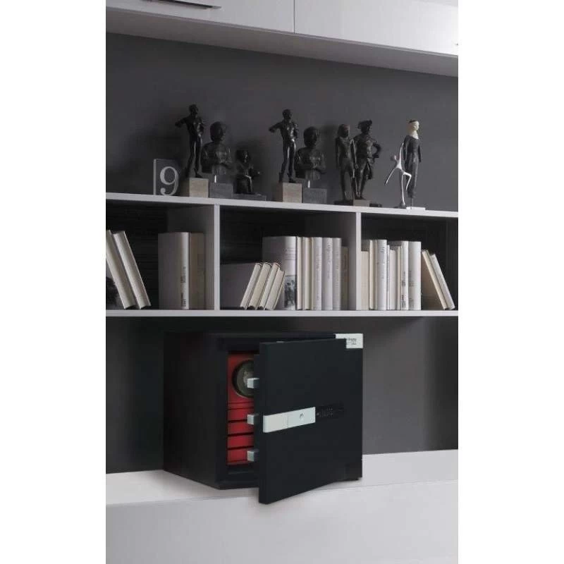 Zur Standardausstattung zählt ein edles Elektronikschloss der Sícherheitsstufe B, zertifiziert nach EN 1300. Dieses verfügt über eine Öffnungsverzögerungszeit, sowie ein stylishes Push & Pull-Bedienelement aus hochwertigem Aluminium. Zusätzlich zur Standardausstattung ist eine Vielzahl von hochwertigen Einrichtungsvarianten erhältlich, wie kunstlederbezogene Schubladen, Uhrenbeweger oder Waffenhalter.