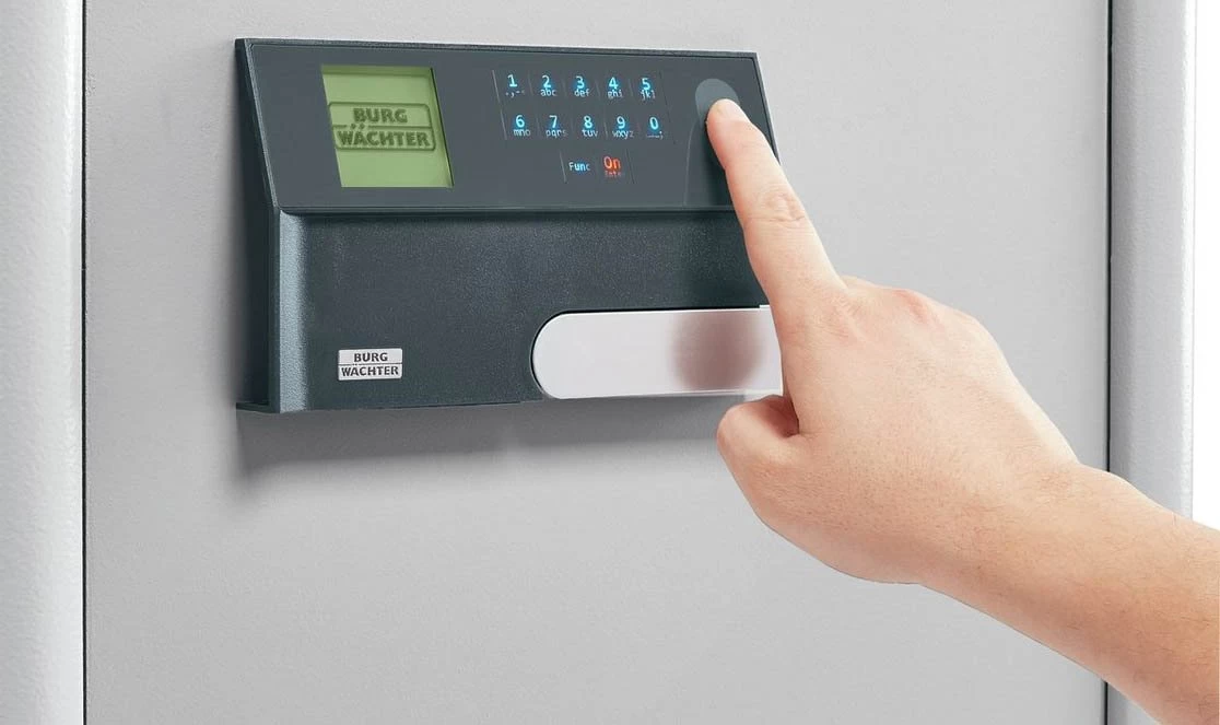 Doppelwandig aufgebaut besitzen diese Schränke eine robuste Tresortür mit innenliegenden Scharnieren ausgestattet mit einem Doppelbart-Sicherheitsschloss oder einem komfortablen Elektronikschloss mit Fingerprintsensor. Die seitliche Verriegelung mit 25 mm starken Rundbolzen und einem Schieberiegel verbindet die Tür sicher mit dem Korpus. Damit der Tresor problemlos und sicher verankert werden kann, ist er mit je zwei, diagonal angeordneten Verankerungsmöglichkeiten in der Rückwand und am Boden vorgerichtet.