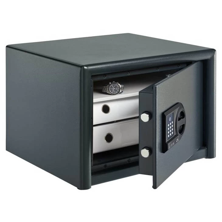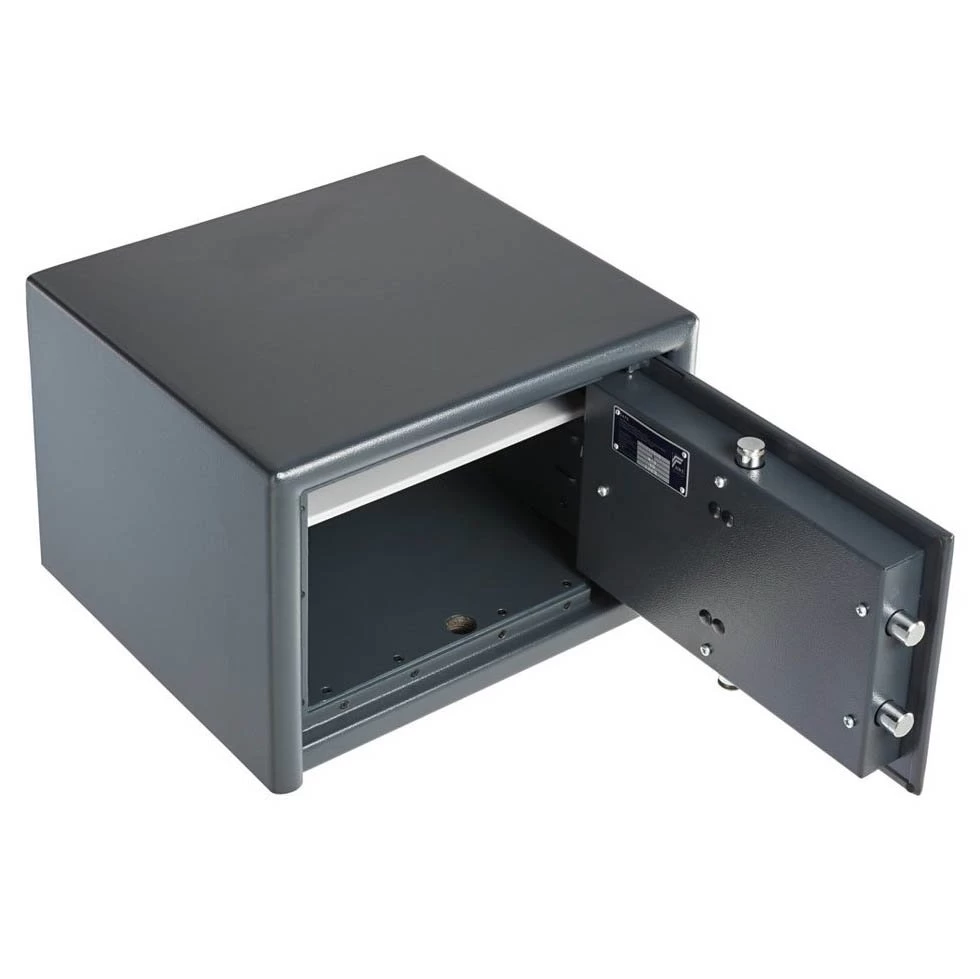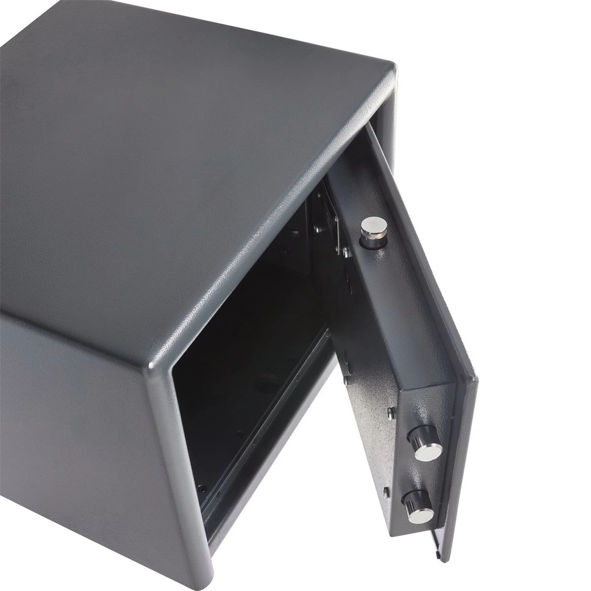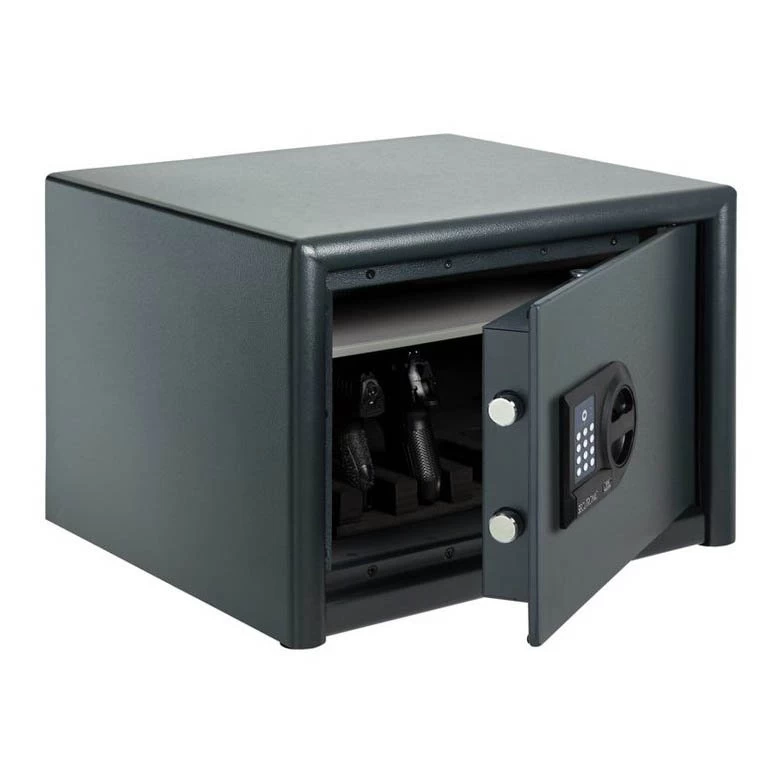 Der modern anmutende Kurzwaffentresor ist doppelwandig aufgebaut und besitzt eine robuste Tresortür mit innenliegenden Scharnieren und einem Doppelbart-Sicherheitsschloss. Dank der seitlichen Verriegelung mit starken Rundbolzen und einer Hintergreifschiene an der Bandseite wird die Tür sicher verschlossen. Damit der Tresor problemlos und sicher verankert werden kann, ist er mit Verankerungsmöglichkeiten in der Rückwand vorgerichtet. Zur Auswahl steht neben dem klassischen Doppelbart-Schlüsselschloss auch ein komfortables Elektronikschloss.