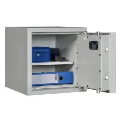Doppelwandig aufgebaut besitzen diese Schränke eine robuste Tresortür mit innenliegenden Scharnieren ausgestattet mit einem Doppelbart-Sicherheitsschloss oder einem komfortablen Elektronikschloss. Die seitliche Verriegelung mit 25 mm starken Rundbolzen und einem Schieberiegel verbindet die Tür sicher mit dem Korpus. Damit der Tresor problemlos und sicher verankert werden kann, ist er mit je zwei, diagonal angeordneten Verankerungsmöglichkeiten in der Rückwand und am Boden vorgerichtet.