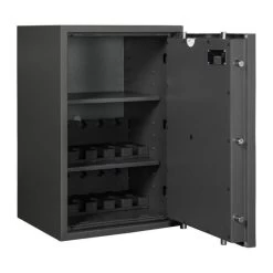 Mit der durch ECB-S und VdS typgeprüften und überwachten Sicherheit, setzt der Ranger N 5 S neue Maßstäbe in seiner Preisklasse. Serienmäßig wird ein hochsicheres Doppelbartschloss mit 2 Schlüsseln verbaut. Auf Wunsch kann man den Schrank mit dem hochwertigen Elektronikschloss SecuTronic ausstatten.