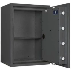 Auf Wunsch kann dieses Schloss auch durch ein elektronisches Zahlenschloss mit Fingerprint-Modul ersetzt werden. Dies bietet ein Grafik-Display und ermöglicht es neben einem Admin-Code noch bis zu 9 Benutzer-Codes und bis zu 20 Fingerabdrücke zu verwenden. Diverse Zeitfunktionen und Rechtevergabe sorgen für hohe Flexibilität. Die Schlossarmatur des Elektronikschlosses steht dabei 20 mm vor