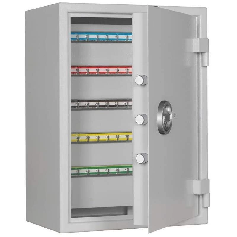 Die Schlüsselschränke der Baureihe ST von Format sind ein idealer und sicherer Aufbewahrungsort für Schlüsselbestände speziell von kleinen und mittelständischen Betrieben. Sie sind je nach individuellen Anforderungen in insgesamt 6 verschiedenen Größen erhältlich und bieten auf 70 bis 300 beschriftbaren Haken großzügigen Platz für Ihre Schlüssel. Mit der zertifizierten Sicherheitsstufe S1 weist diese Serie zudem einen soliden Einbruchschutz auf: Die doppelwandige Tür wird mit einer massiven, 3-seitigen Schließbolzen-Verriegelung abgesperrt.