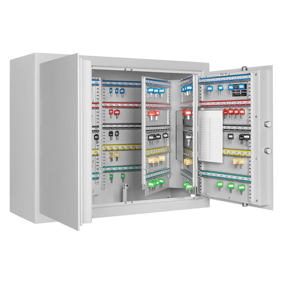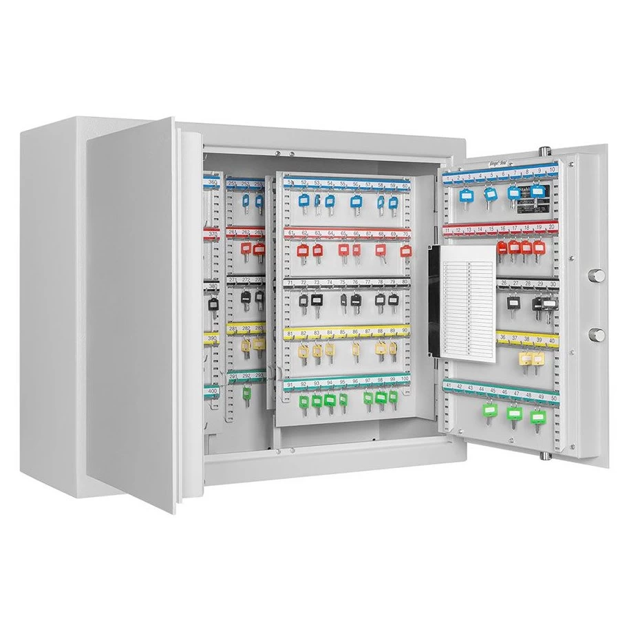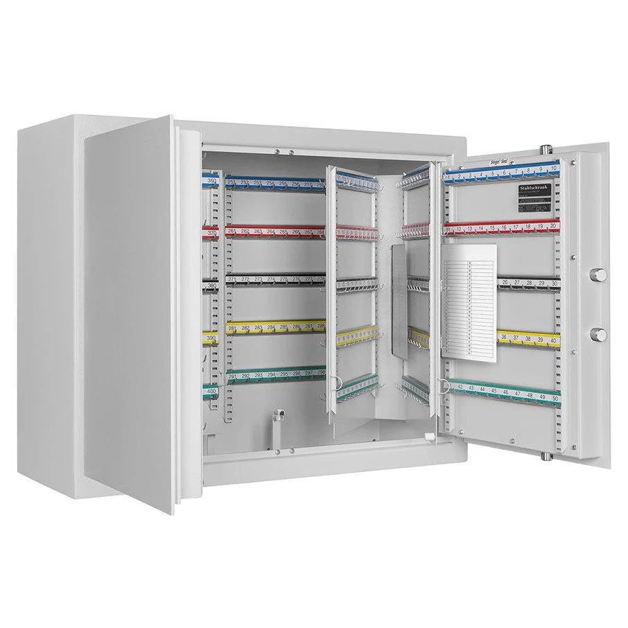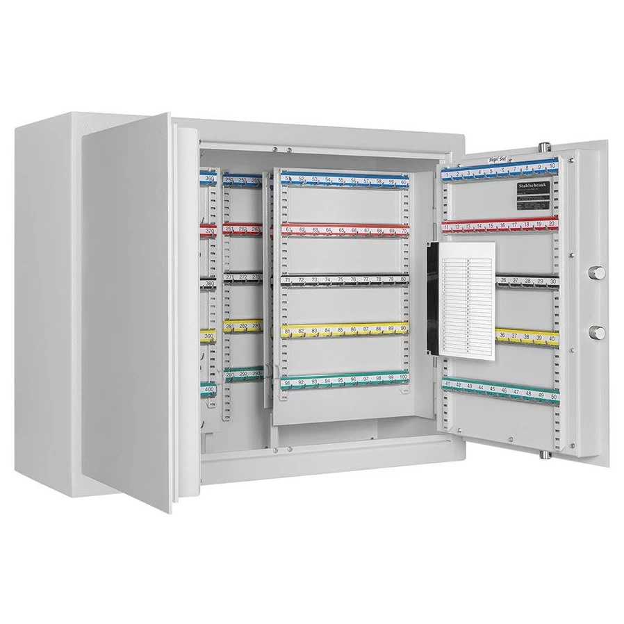 Die Schlüsseltresore der STZ-Baureihe von Format sind ein sicherer und übersichtlicher Aufbewahrungsort für bis zu 400 oder 600 Schlüssel. Mit Sicherheitsstufe A nach VDMA 24992 bieten sie gute Sicherheit auch für sensible Schlüssel. Dank der zweitürigen Konstruktion, können Schlüssel übersichtlich und komfortabel gesichert und auch wieder entnommen werden.