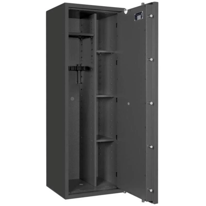 Die Waffenschränke der Serie Capriolo bieten großzügigen Platz für 3 bis 14 Langwaffen. Auch die dazugehörige Munition sowie maximal 5 bzw. 10 Kurzwaffen finden hier gemäß den bundesdeutschen Waffengesetzen einen sicheren Aufbewahrungsort.* Dank der strukturierten Schrankeinteilung ist eine übersichtliche Lagerung Ihrer Waffen problemlos und bequem möglich. Die Waffentresore bestehen aus einem 3-wandigen Korpus und einer 3-wandigen Tür, welche mittels einer sicheren, 4-seitigen Verriegelung durch 20 mm starke Schließbolzen abgeschlossen wird.