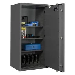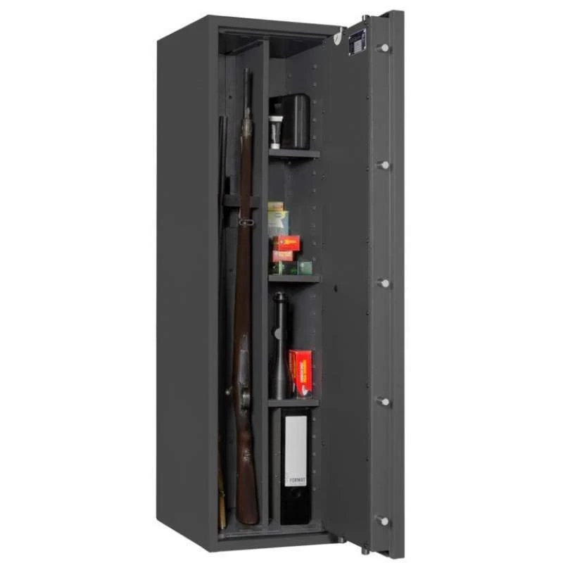 Die Waffenschränke der Serie Capriolo bieten großzügigen Platz für 3 bis 14 Langwaffen. Auch die dazugehörige Munition sowie maximal 5 bzw. 10 Kurzwaffen finden hier gemäß den bundesdeutschen Waffengesetzen einen sicheren Aufbewahrungsort.* Dank der strukturierten Schrankeinteilung ist eine übersichtliche Lagerung Ihrer Waffen problemlos und bequem möglich. Die Waffentresore bestehen aus einem 3-wandigen Korpus und einer 3-wandigen Tür, welche mittels einer sicheren, 4-seitigen Verriegelung durch 20 mm starke Schließbolzen abgeschlossen wird.