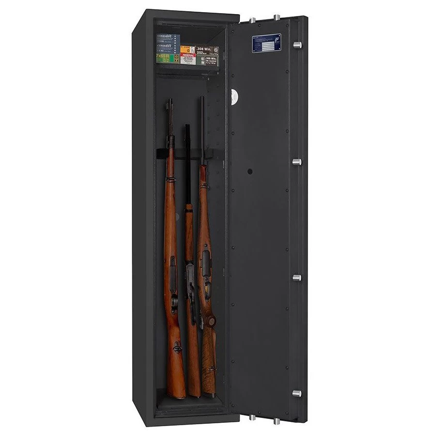 Die Waffenschränke der Serie Corvino bieten in 9 verschiedenen Ausführungen großzügig Platz für 3 bis 14 Langwaffen. Auch die dazugehörige Munition sowie maximal 5 bzw. 10 Kurzwaffen finden hier gemäß den bundesdeutschen Waffengesetzen einen sicheren Aufbewahrungsort.* Dank der strukturierten Schrankeinteilung ist eine übersichtliche Lagerung Ihrer Waffen problemlos und bequem möglich. Die Waffentresore werden mittels einer sicheren, 4-seitigen Verriegelung durch massive Schließbolzen abgeschlossen.