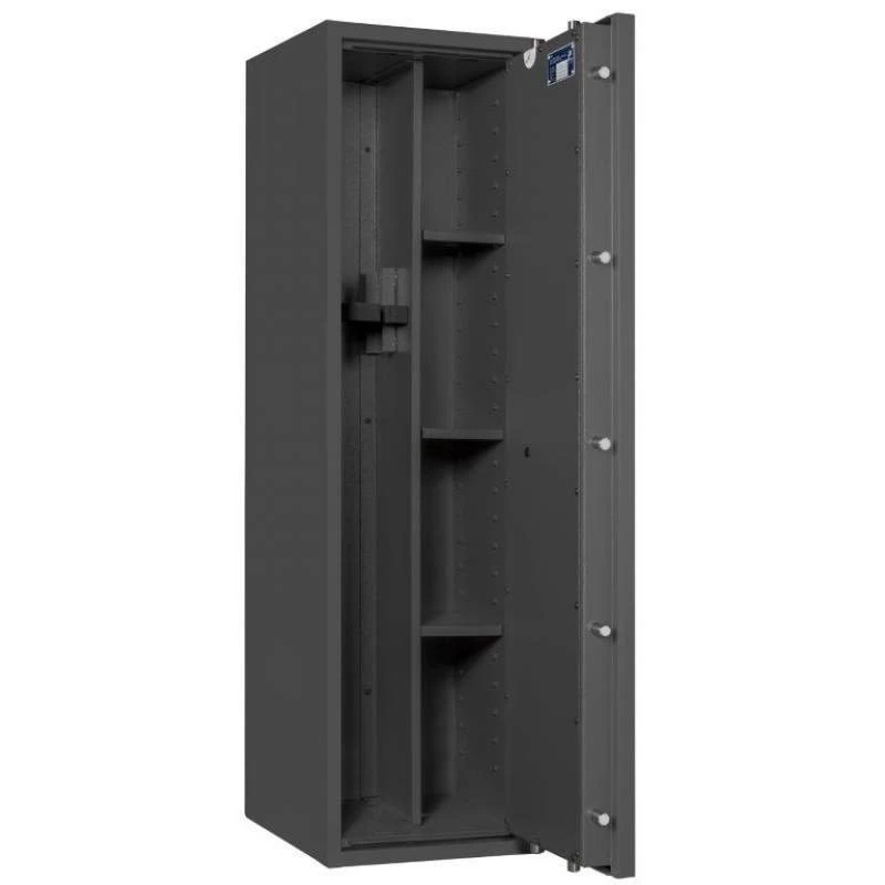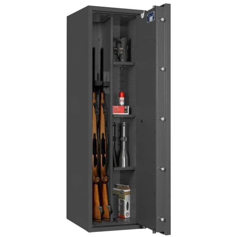 Die Waffenschränke der Serie Corvino bieten in 8 verschiedenen Ausführungen großzügig Platz für 3 bis 14 Langwaffen. Auch die dazugehörige Munition sowie unbegrenzt viele Kurzwaffen finden hier gemäß den bundesdeutschen Waffengesetzen einen sicheren Aufbewahrungsort. Dank der strukturierten Schrankeinteilung ist eine übersichtliche Lagerung Ihrer Waffen problemlos und bequem möglich. Die Waffentresore werden mittels einer sicheren, 4-seitigen Verriegelung durch massive Schließbolzen abgeschlossen.