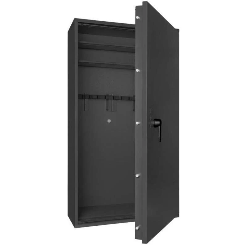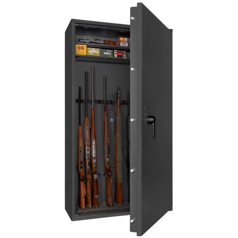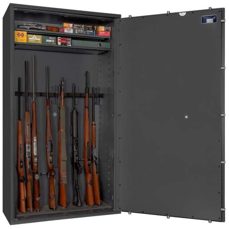 Die Waffenschränke der Serie Corvino bieten in 8 verschiedenen Ausführungen großzügig Platz für 3 bis 14 Langwaffen. Auch die dazugehörige Munition sowie unbegrenzt viele Kurzwaffen finden hier gemäß den bundesdeutschen Waffengesetzen einen sicheren Aufbewahrungsort. Dank der strukturierten Schrankeinteilung ist eine übersichtliche Lagerung Ihrer Waffen problemlos und bequem möglich. Die Waffentresore werden mittels einer sicheren, 4-seitigen Verriegelung durch massive Schließbolzen abgeschlossen.