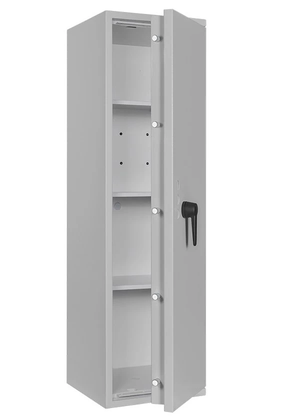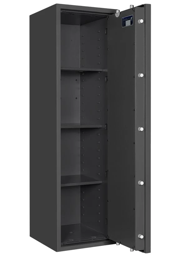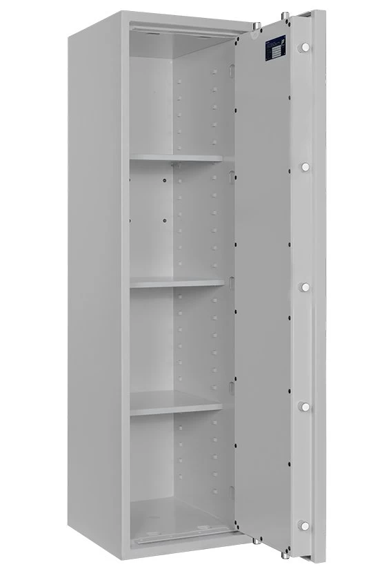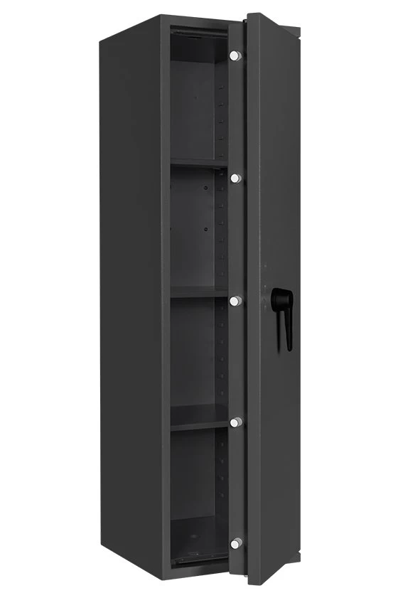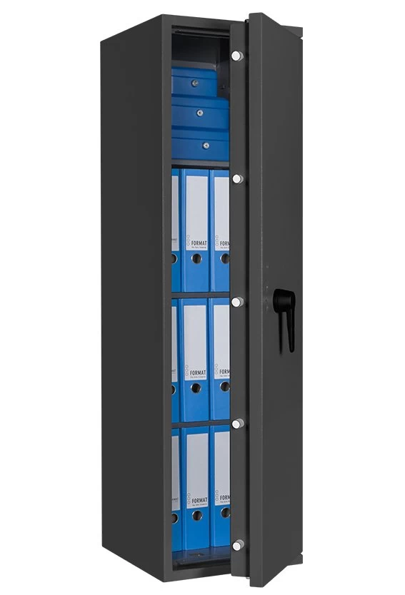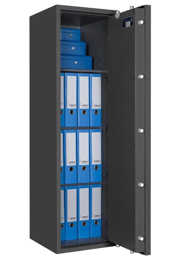 Die hochwertigen Wertschutzschränke der Serie Lyra von Format weisen die Sicherheitsstufe 0 auf. Alle Modelle der Baureihe sind wahlweise auch in der Sicherheitsstufe 1 erhältlich. Die Lyra-Schränke können zudem als Möbeleinsatz- oder BTM-Tresore verwendet werden und punkten mit ihren kompakten Abmessungen sowie dem geringen Gewicht. Sie bestehen aus einem allseitig dreiwandigen Korpus, einer dreiwandigen Tür und einem starren Hintergreifprofil an der Bandseite. Durch die im Rahmen angebrachten Türbänder lässt sich die Tür bis zu einem Winkel von 180° öffnen, womit der Inhalt des Safes stets problemlos zugänglich ist. Zusätzlich wird der Tresor durch eine vierseitige Bolzen-Verriegelung geschützt.