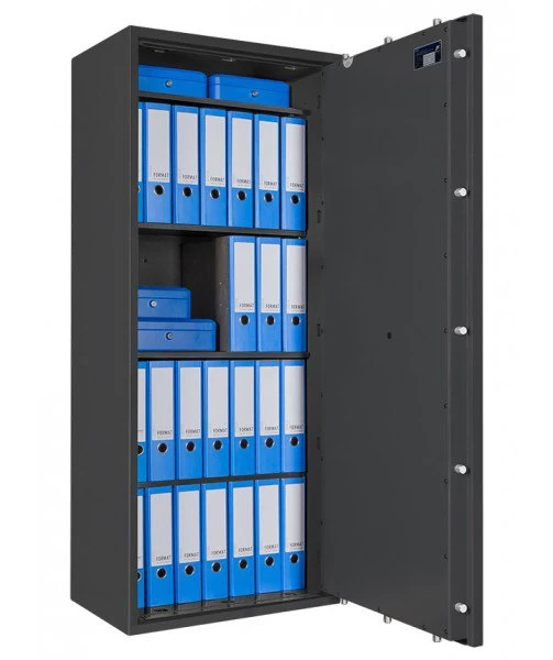 Die hochwertigen Wertschutzschränke der Serie Lyra von Format weisen die Sicherheitsstufe 0 auf. Alle Modelle der Baureihe sind wahlweise auch in der Sicherheitsstufe 1 erhältlich. Die Lyra-Schränke können zudem als Möbeleinsatz- oder BTM-Tresore verwendet werden und punkten mit ihren kompakten Abmessungen sowie dem geringen Gewicht. Sie bestehen aus einem allseitig dreiwandigen Korpus, einer dreiwandigen Tür und einem starren Hintergreifprofil an der Bandseite. Durch die im Rahmen angebrachten Türbänder lässt sich die Tür bis zu einem Winkel von 180° öffnen, womit der Inhalt des Safes stets problemlos zugänglich ist. Zusätzlich wird der Tresor durch eine vierseitige Bolzen-Verriegelung geschützt.