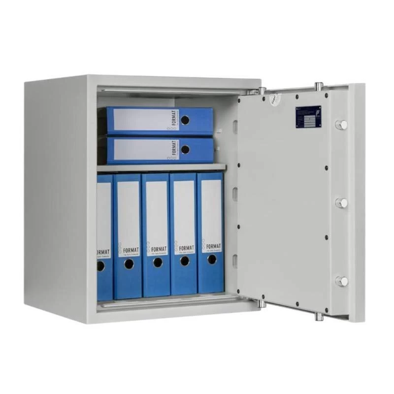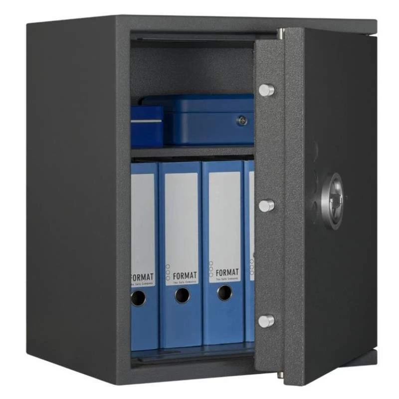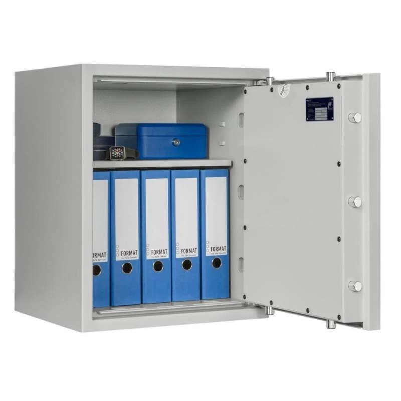 Die hochwertigen Wertschutzschränke der Serie Lyra von Format weisen die Sicherheitsstufe 1 auf. Alle Modelle der Baureihe sind wahlweise auch in der Sicherheitsstufe 0 erhältlich. Die Lyra-Schränke können zudem als Möbeleinsatz- oder BTM-Tresore verwendet werden und punkten mit ihren kompakten Abmessungen sowie dem geringen Gewicht. Sie bestehen aus einem allseitig dreiwandigen Korpus, einer dreiwandigen Tür und einem starren Hintergreifprofil an der Bandseite. Durch die im Rahmen angebrachten Türbänder lässt sich die Tür bis zu einem Winkel von 180° öffnen, womit der Inhalt des Safes stets problemlos zugänglich ist. Zusätzlich wird der Tresor durch eine vierseitige Bolzen-Verriegelung geschützt.