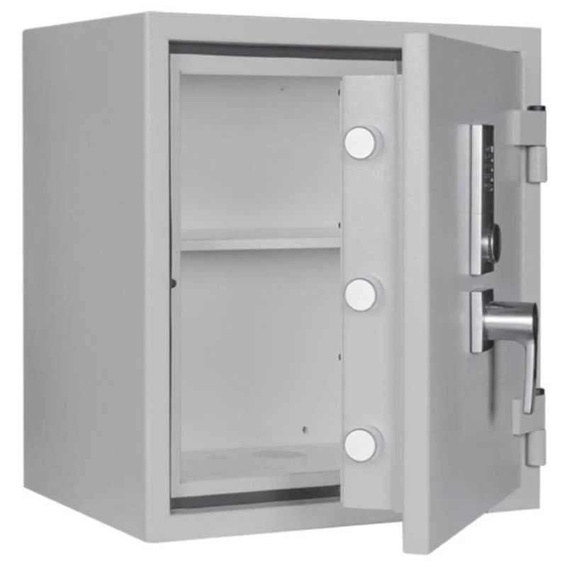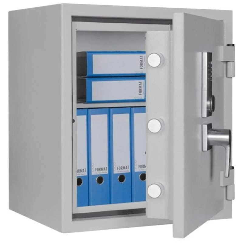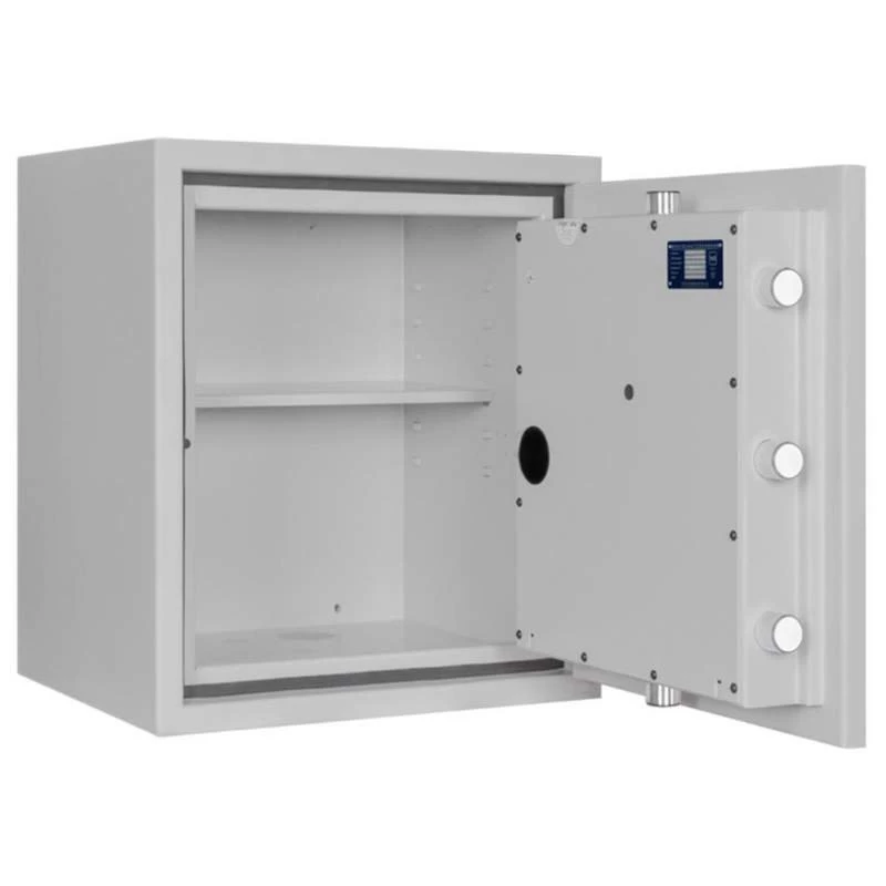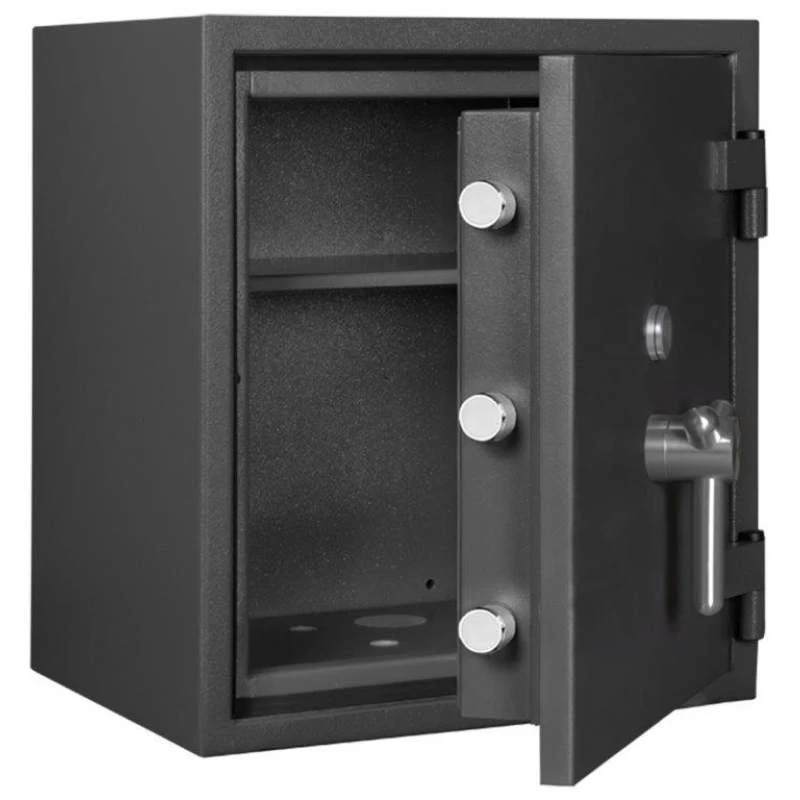 Die Wertschutzschränke bieten eine höchst widerstandsfähige Türfront sowie einen Korpus, der gegen Angriffe mit thermisch und mechanisch wirkenden Einbruchswerkzeugen geschützt ist. Eine sichere, 4-seitige Verriegelung mit massiven Schließbolzen verhindert den unbefugten äußeren Zugriff. An der Bandseite ist die Tür mit einem starren Hintergreifprofil geschützt. Die Tresore sind zudem für den Einbau einer Einbruchmeldeanlage vorgerichtet.