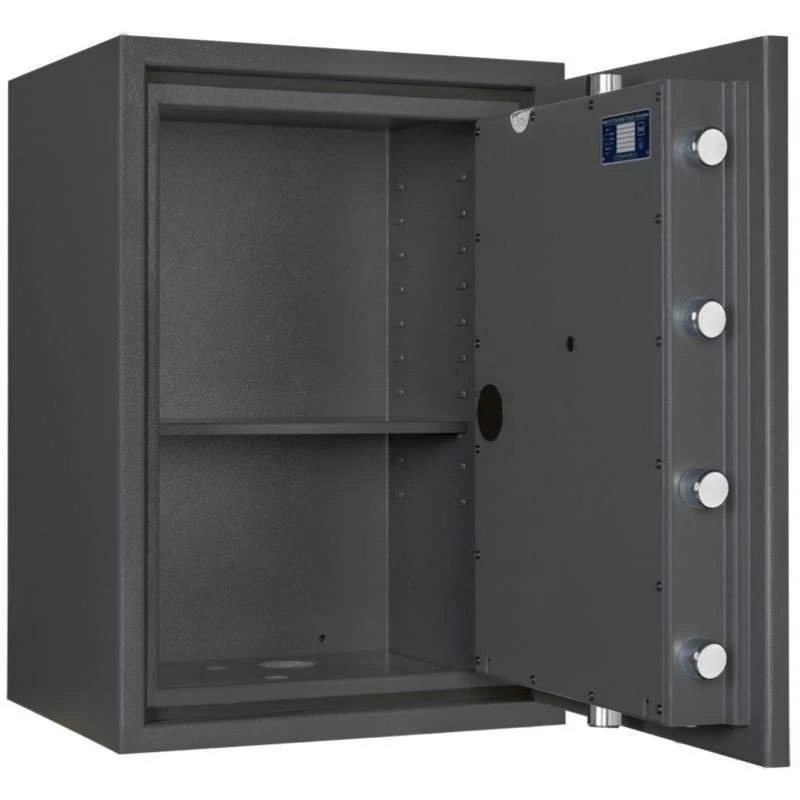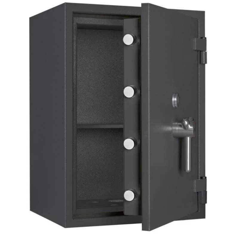 Die Wertschutzschränke bieten eine höchst widerstandsfähige Türfront sowie einen Korpus, der gegen Angriffe mit thermisch und mechanisch wirkenden Einbruchswerkzeugen geschützt ist. Eine sichere, 4-seitige Verriegelung mit massiven Schließbolzen verhindert den unbefugten äußeren Zugriff. An der Bandseite ist die Tür mit einem starren Hintergreifprofil geschützt. Die Tresore sind zudem für den Einbau einer Einbruchmeldeanlage vorgerichtet.