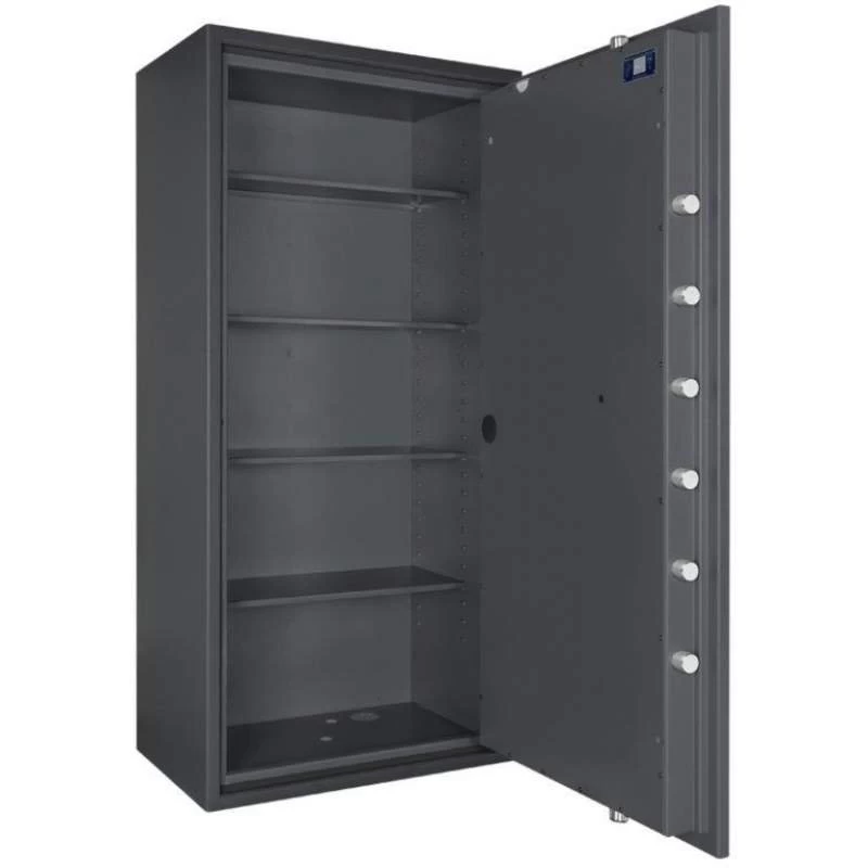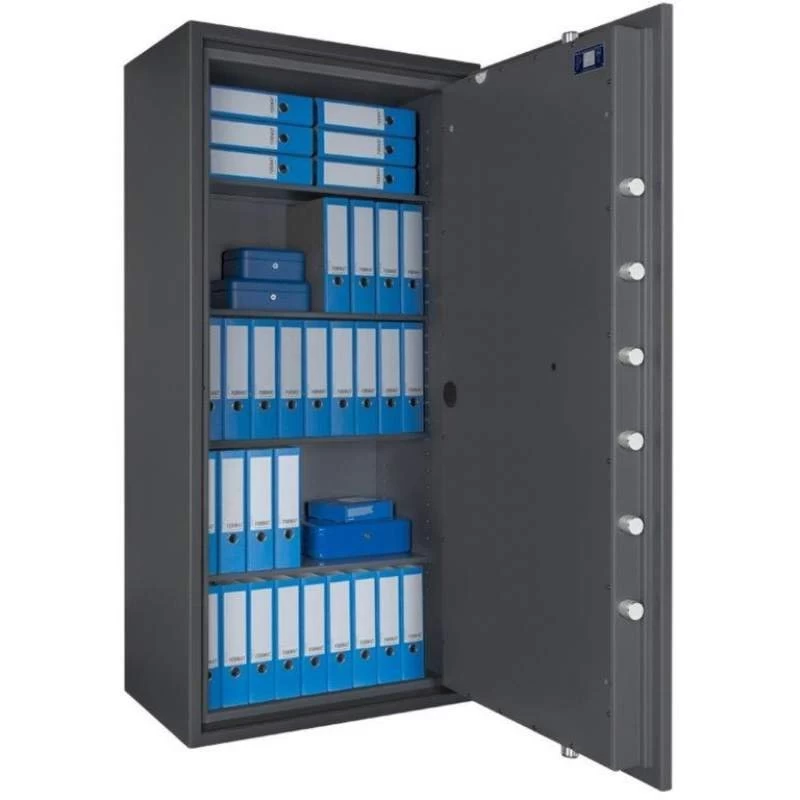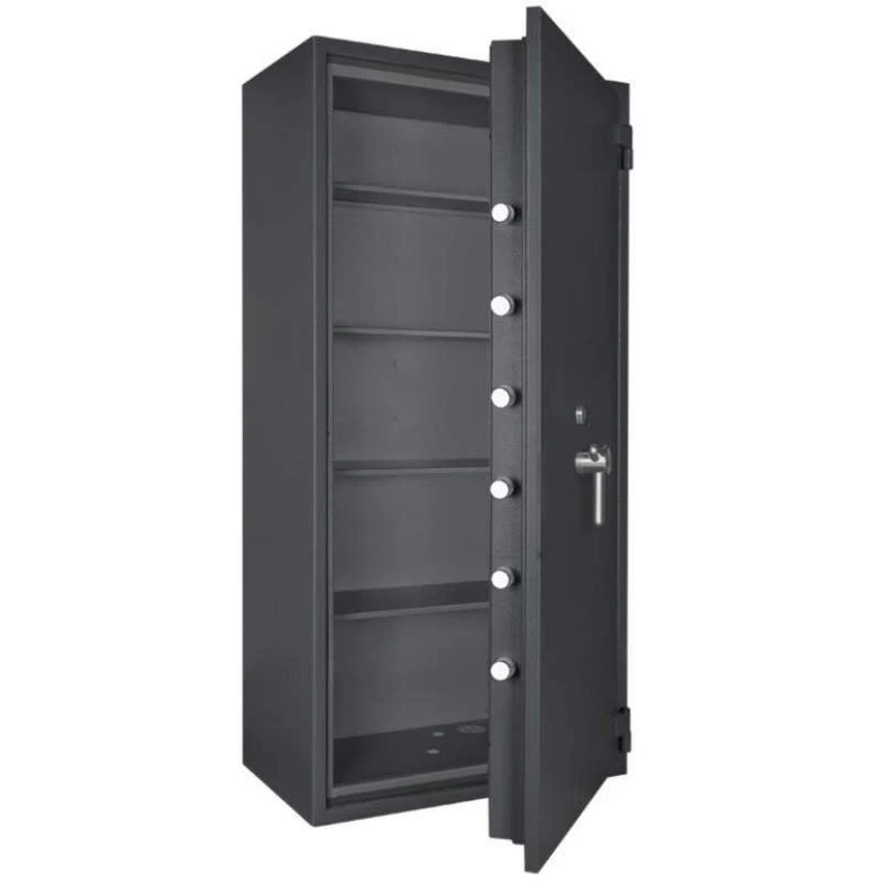 Die Wertschutzschränke bieten eine höchst widerstandsfähige Türfront sowie einen Korpus, der gegen Angriffe mit thermisch und mechanisch wirkenden Einbruchswerkzeugen geschützt ist. Eine sichere, 4-seitige Verriegelung mit massiven Schließbolzen verhindert den unbefugten äußeren Zugriff. An der Bandseite ist die Tür mit einem starren Hintergreifprofil geschützt. Die Tresore sind zudem für den Einbau einer Einbruchmeldeanlage vorgerichtet.