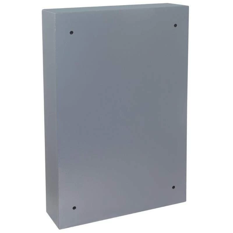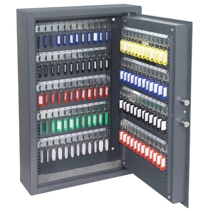 Die Hakenleisten sind dabei frei verstellbar, damit eine übersichtliche und komfortable Lagerung von unterschiedlichsten Schlüsseln ermöglicht wird. Der Korpus besteht aus hochwertigem, 3mm starkem Stahlblech und die Verriegelung geschieht über 2 massive Bolzen. Die kratzfeste Pulverbeschichtung ist in einem unauffälligem anthrazit-grau gehalten.