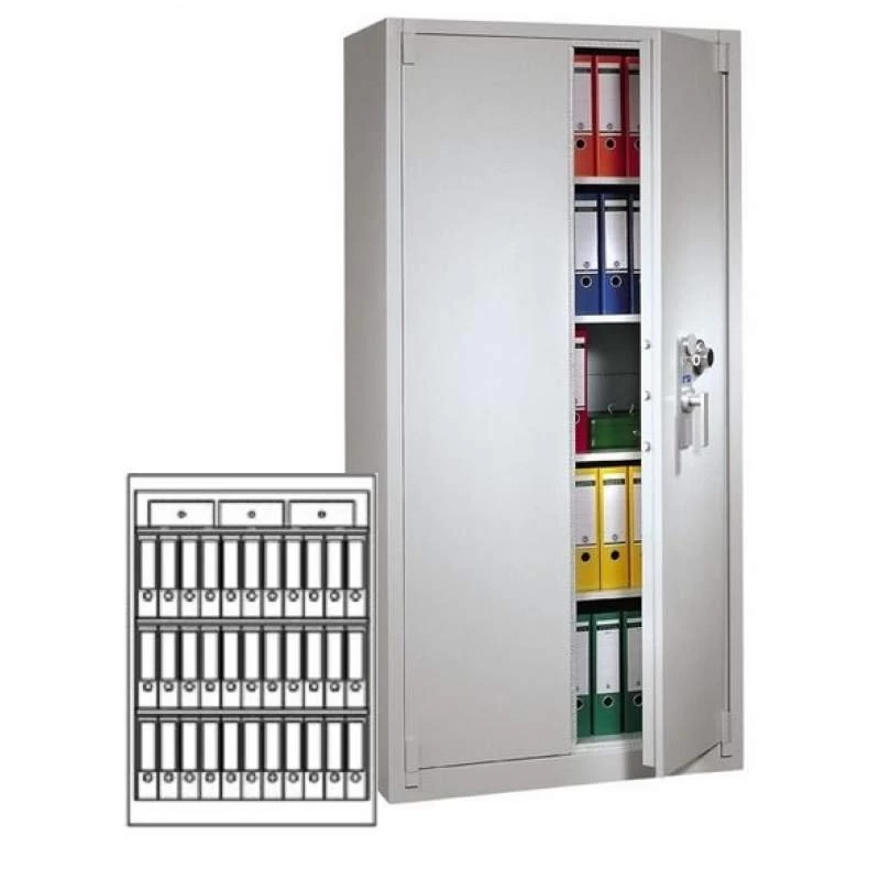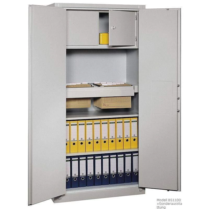 Die Stahlschränke aus der BS-Serie von Müller Safe sind eine ideale Wahl für überall dort, wo größere Mengen von Akten vor fremdem Zugriff oder leichten Bränden geschützt werden sollen. Diese doppelwandigen Safes bieten neben einer hohen Sicherheit und viel Platz auch ein ansprechendes Design, welches sich problemlos mit dem vorhandenen Büromobiliar kombinieren lässt. Aufgrund ihrer doppelten Wandung mit einer feuerbeständigen Isolierfüllung nach DIN 4102 sowie einem rund umlaufenden Feuerfalz schützen diese Stahlschränke Ihre wichtigen Akten vor leichten Bränden. Kräftige Rundbolzen sichern die Schränke zudem vor fremdem, unerwünschtem Zugriff ab. BS-Stahlschränke sind mit den unterschiedlichsten Fassungsvermögen erhältlich, alle Modelle besitzen jedoch Ordnertiefe und sind bereits bei der Auslieferung mit höhenverstellbaren Fachböden ausgerüstet.