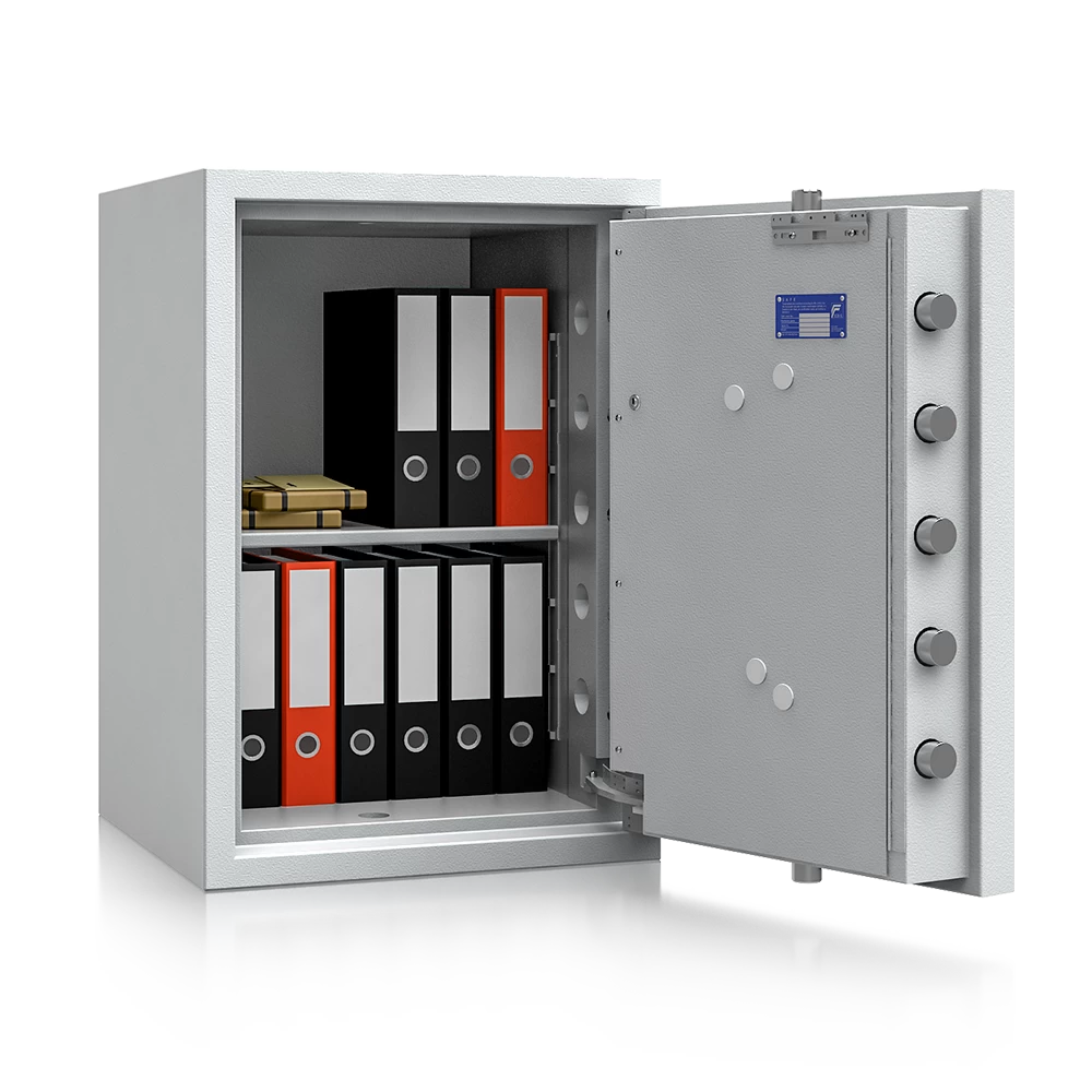 Mit einem Wertschutztresor der Baureihe EW 5 von Müller Safe können Sie je nach Ausführung kleine oder größere Mengen an Wertgegenständen, Akten und Dokumenten hochsicher aufbewahren. Diese robusten Tresore bieten eine sehr hohe Einbruchsicherheit gegen Angriffe mit mechanischen und auch thermischen Einbruchwerkzeugen durch den zertifizierten Widerstandsgrad 5.