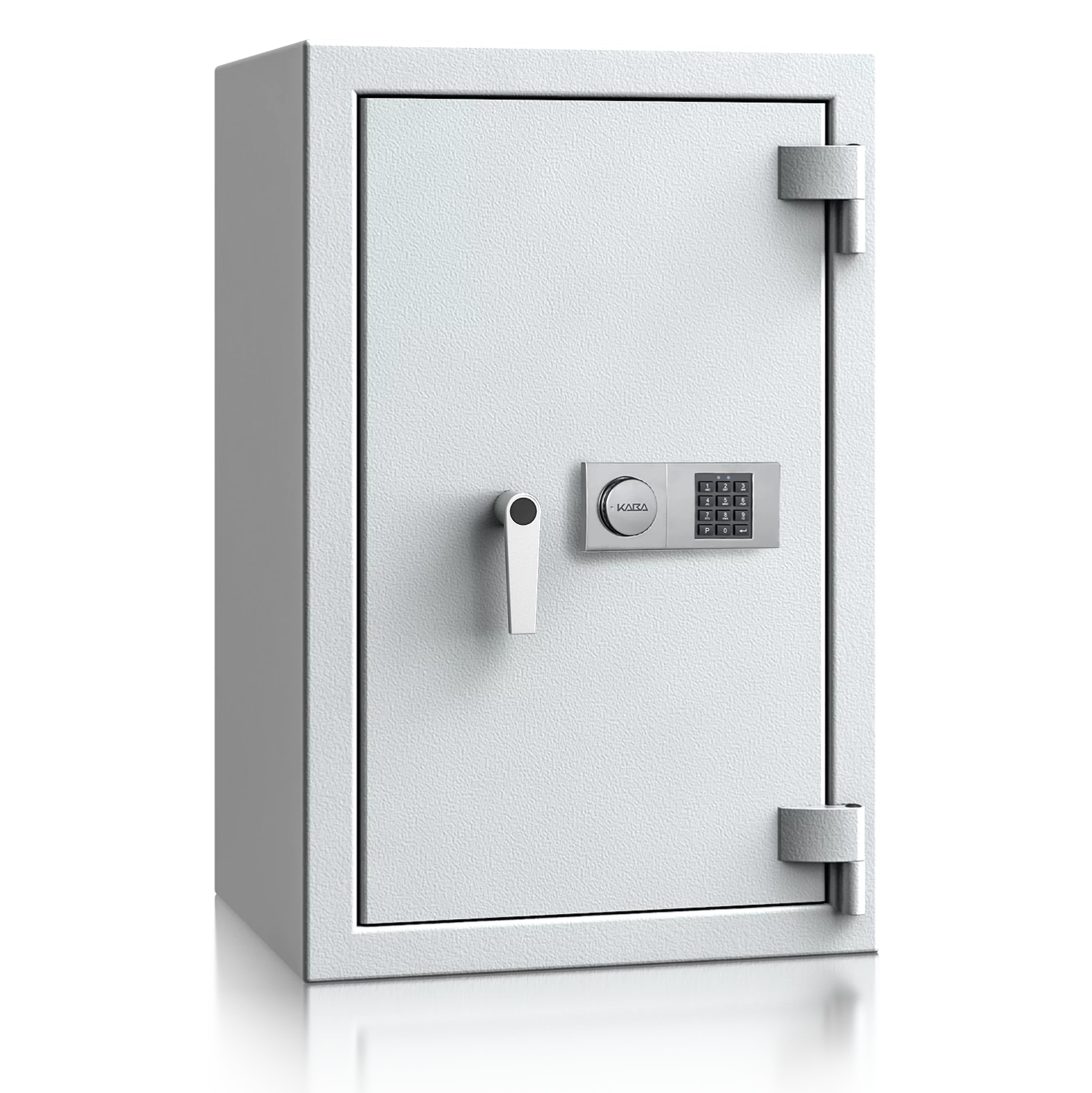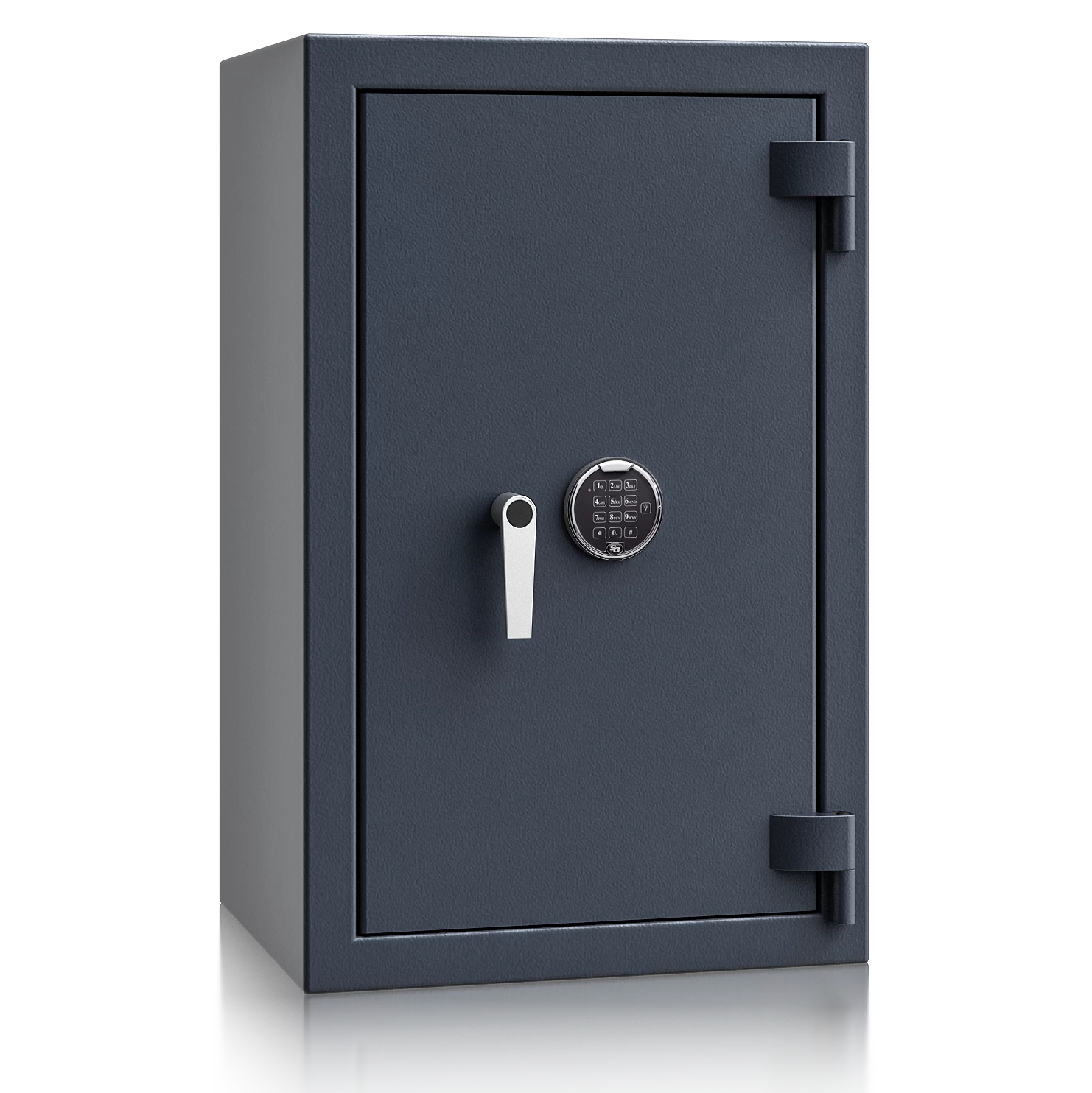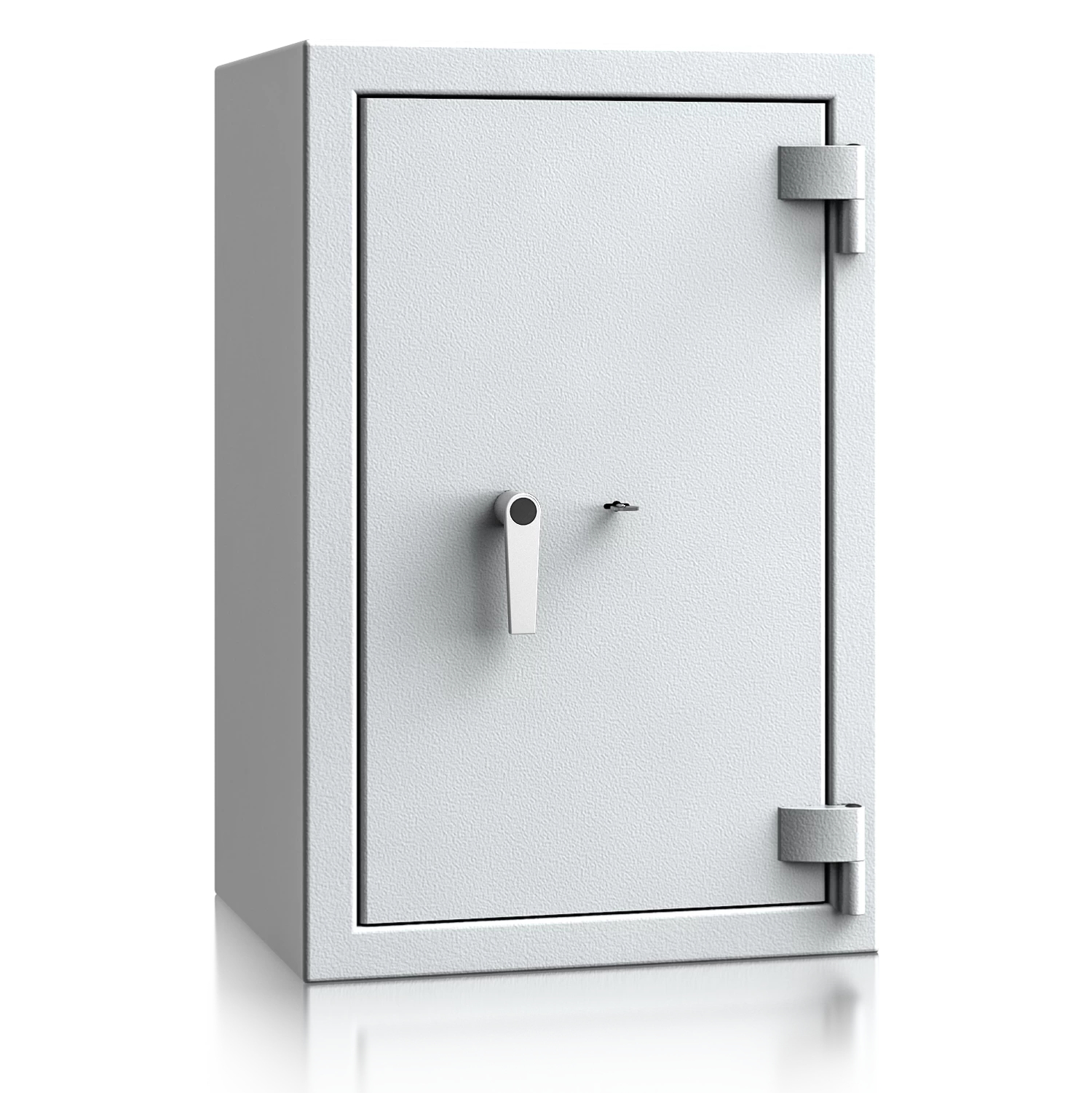 Diese Wertschutztresore werden serienmäßig mit einem hochsicheren Doppelbartschloss der VdS-Klasse 1 ausgeliefert, welches über 2 Schlüssel (120 mm lang) verfügt. Auf Wunsch steht jedes Modell auch mit einem komfortablen elektronischen Tastenschloss zur Auswahl. Für einfache Bedienung sorgt ein hochwertiger Hängegriff aus Metall (60 mm vorstehend).