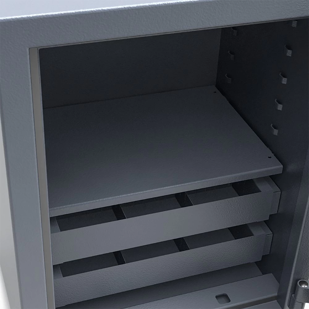 Dieser Schrank wird mit einem hochsicheren Doppelbartschloss inklusive 2 Schlüsseln ausgeliefert. Auf Wunsch steht auch elektronisches Zahlenschloss zur Auswahl. Ein runder Klappgriff dient bei beiden Schlossausführungen zur einfachen Entriegelung (12 mm vorstehend).