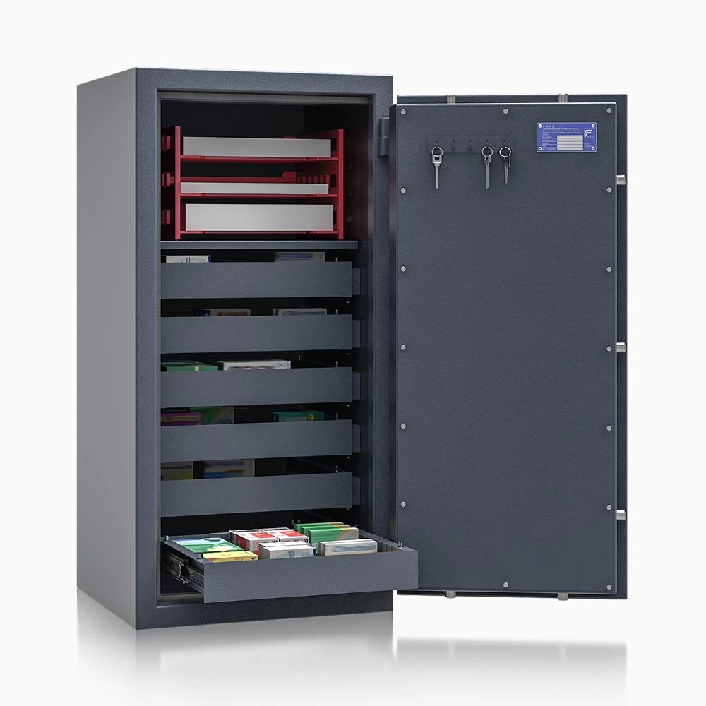 Die BTM Wertschutzschränke bestehen aus einem einwandigen Korpus und einer doppelwandigen Tür. Mittels einer massiven Bolzenverriegelung wird die Tür fest an 3 Seiten mit dem Korpus verbunden. Innenliegende Scharniere sorgen für eine verminderte Angriffsfläche und erlauben einen Türöffnungswinkel von 90°.