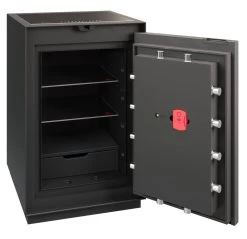 Die mehrwandige Konstruktion aus Qualitäts-Stahl, gefüllt mit hochwertigen Verbundmaterialien sorgt für hohe Sicherheit und gute Isolation. Mit dem 140mm starken, 3fach gekanteten Türaufbau mit verstärkten Bohrschutzplatten und einem Notverriegelungssystem ist stellt auch die Tür keinen Schwachpunkt dar. Ein eingebautes Alarmsystem erkennt Einbruchversuche und schlägt Alarm.