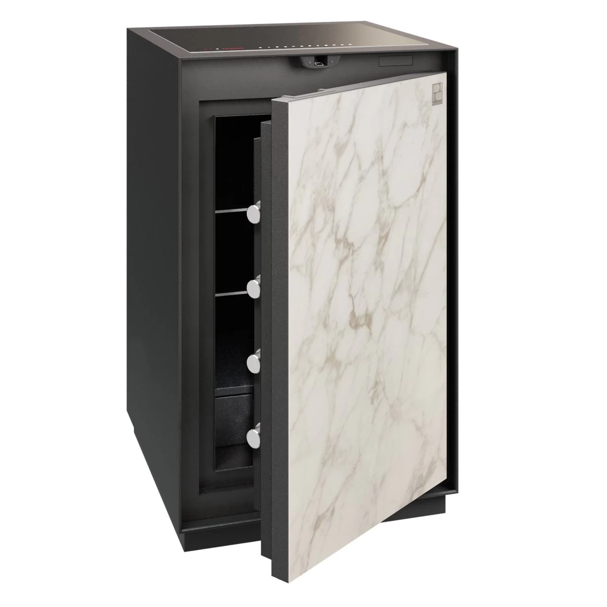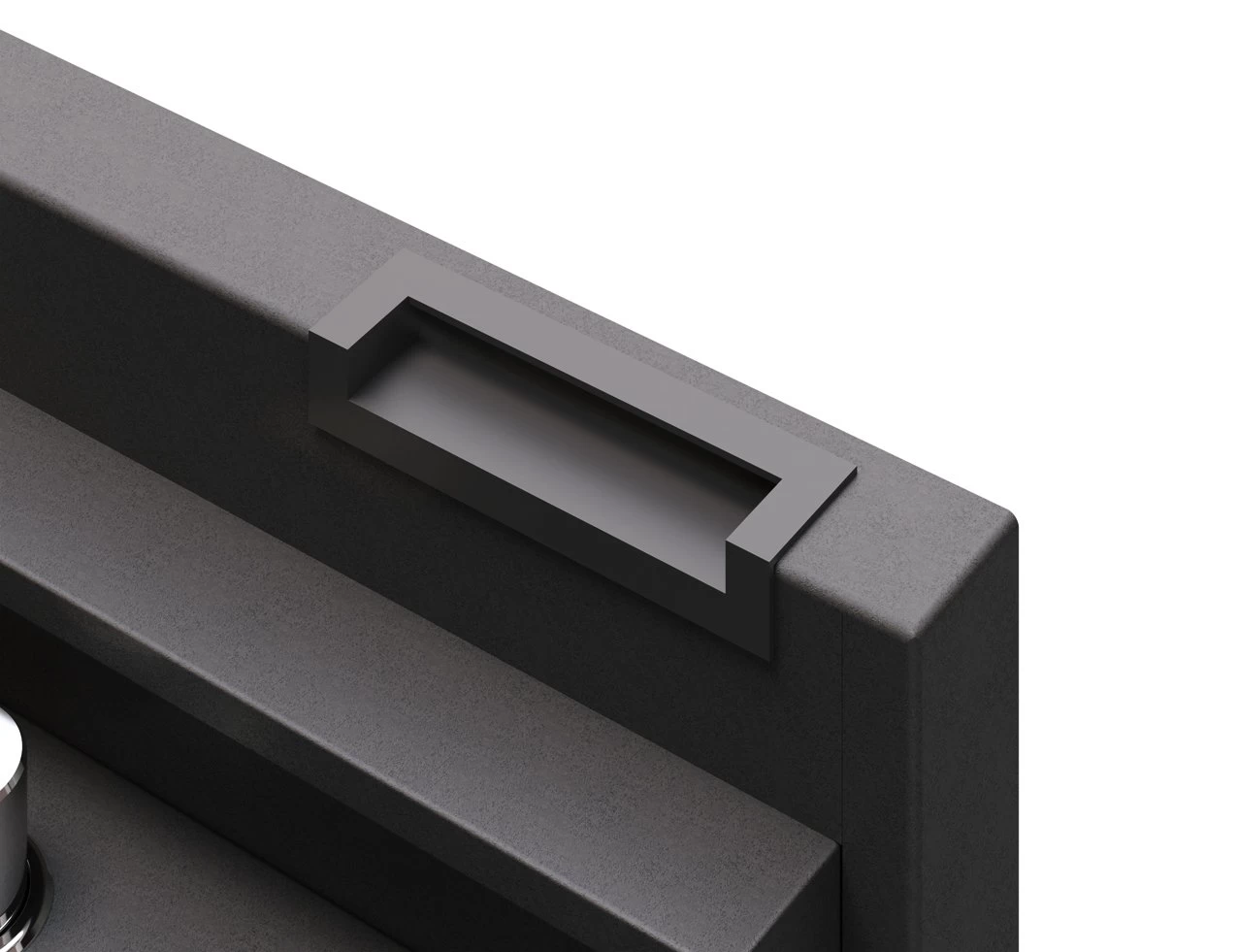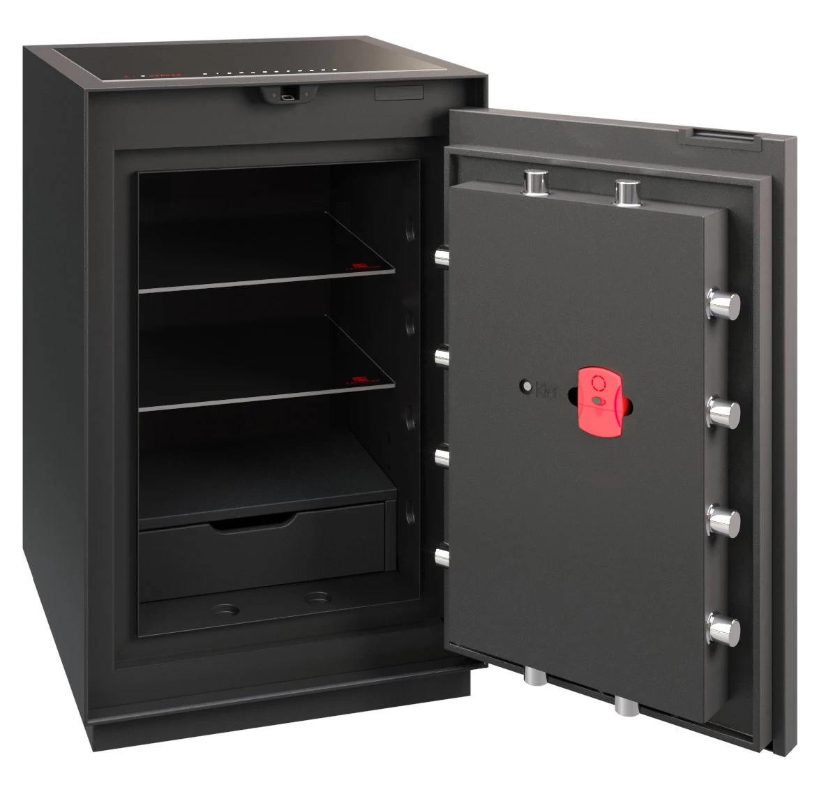 Diese Premium-Tresore verfügen standardmäßig über ein elektronisches Codeschloss mit einer ergonomisch gestalteten Touchpanel-Tastatur aus gehärtetem Glas auf der Oberseite des Tresores sowie alternativ über einen Fingerabdrucksensor zu