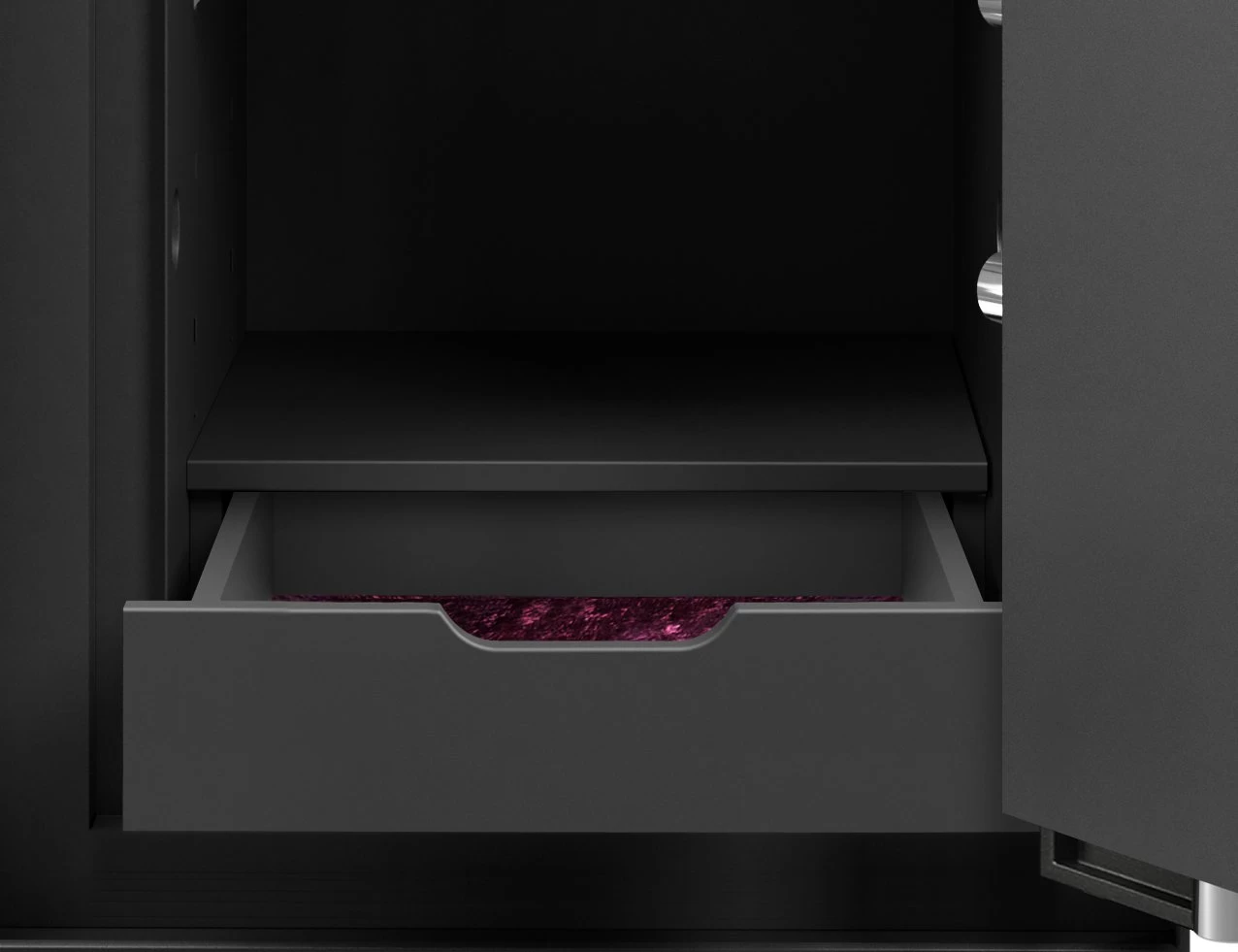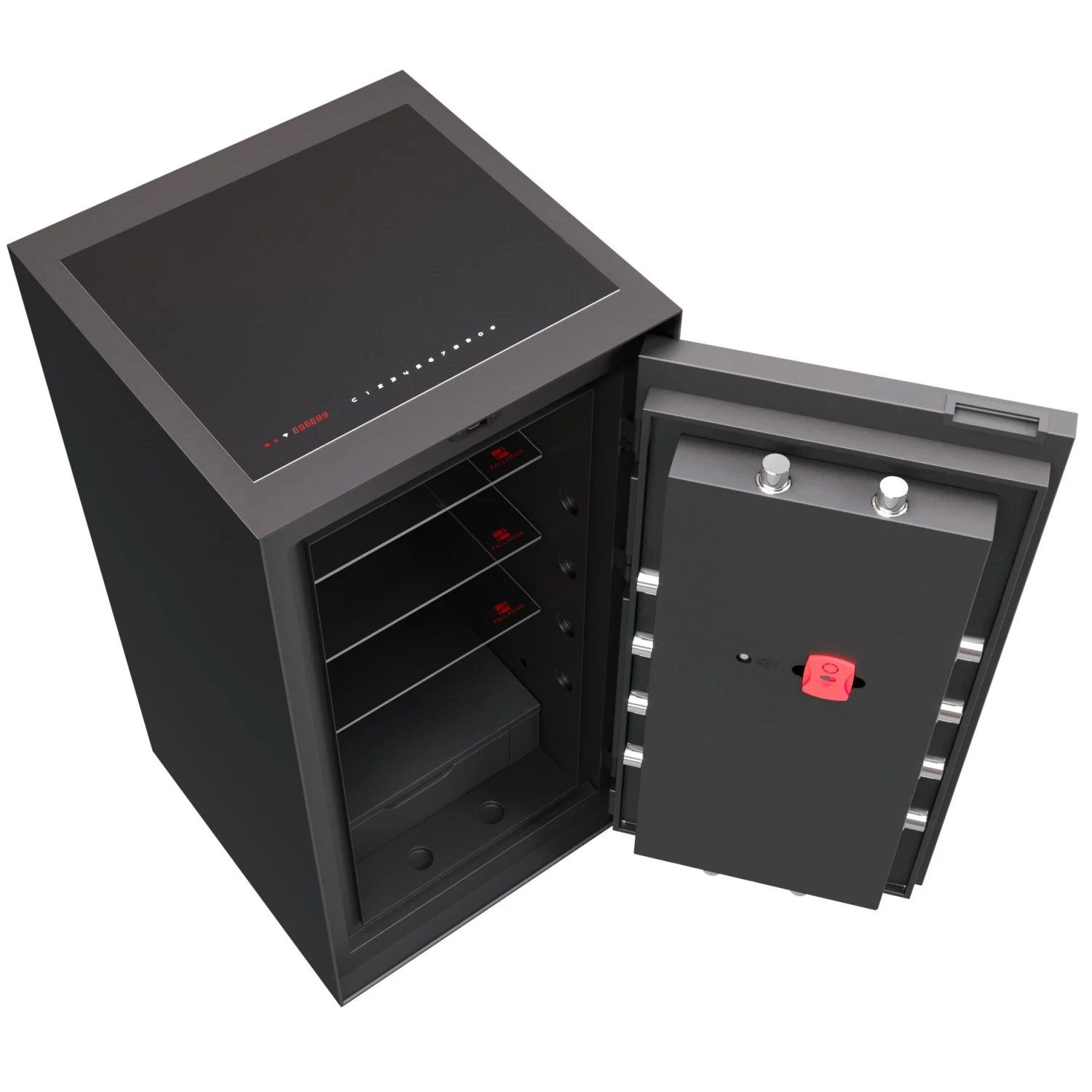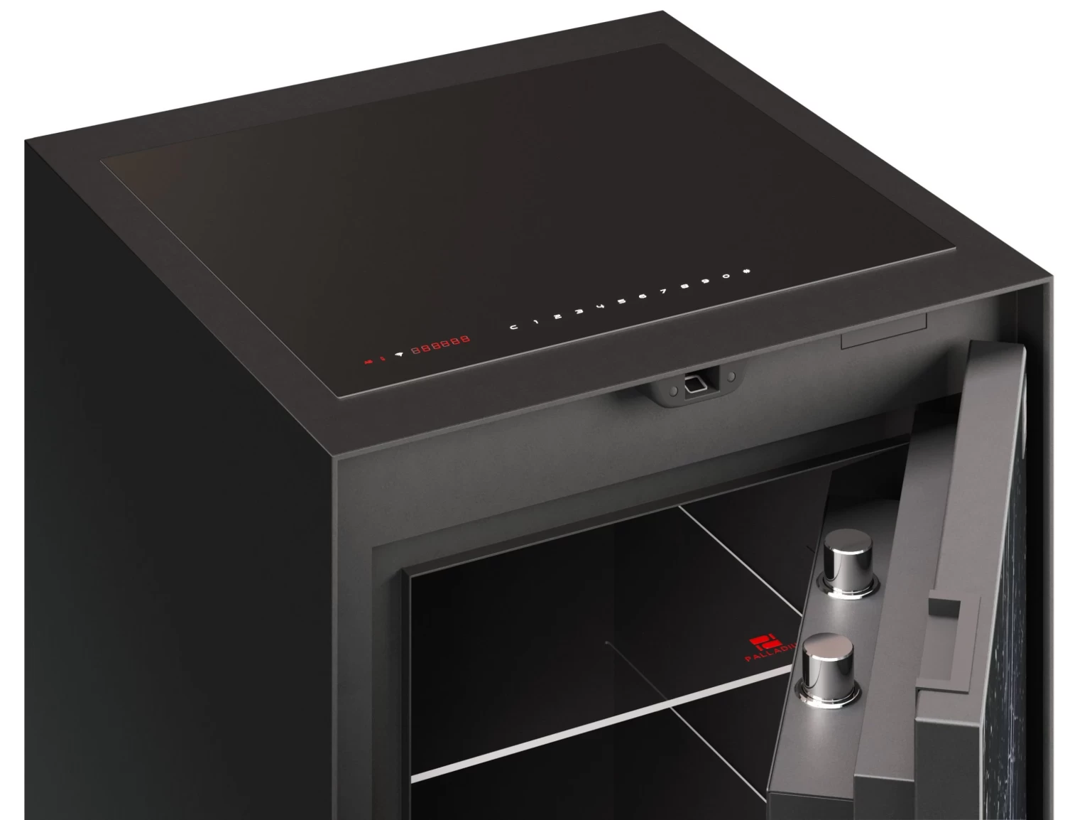 Diese Premium-Tresore verfügen standardmäßig über ein elektronisches Codeschloss mit einer ergonomisch gestalteten Touchpanel-Tastatur aus gehärtetem Glas auf der Oberseite des Tresores sowie alternativ über einen Fingerabdrucksensor zu