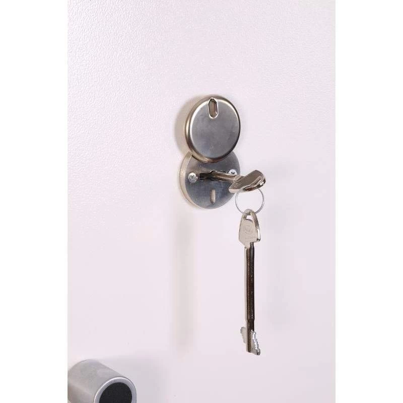 - Der Tresorkorpus sowie die Tür bestehen aus 4 mm starkem Stahl, die Tür ist durch ein 3-seitiges Riegelwerk und spezielle Bohrschutzplatten besonders abgesichert