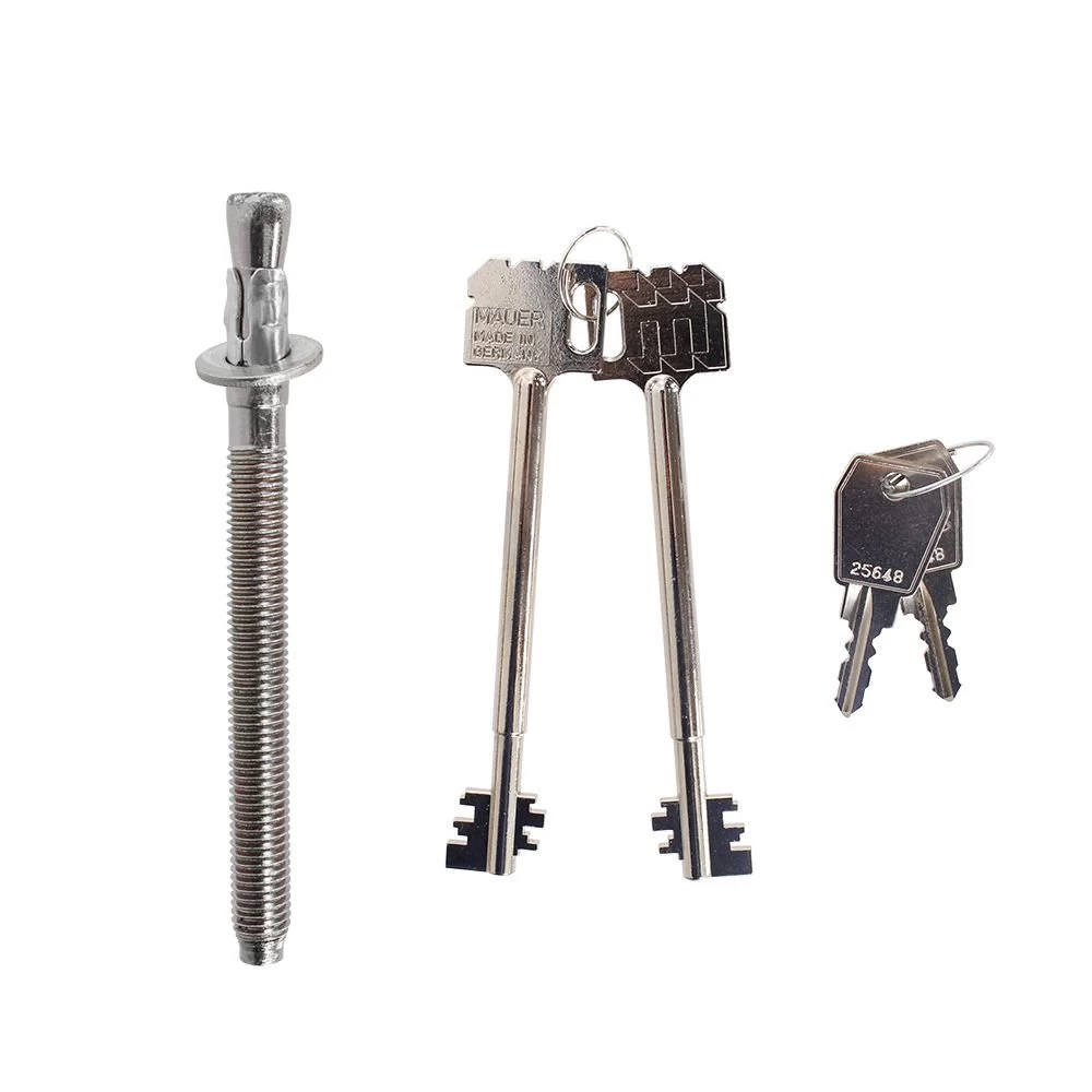 Die Atlas Fire-Feuerschutztresore sind bei der Auslieferung mit einer Bohrung zur Bodenverankerung (durchgebohrt, Ø 12 mm) vorbereitet. Entsprechendes Befestigungsmaterial für die Betonverankerung (Schraube: M12 x 140) ist bereits im Lieferumfang enthalten.