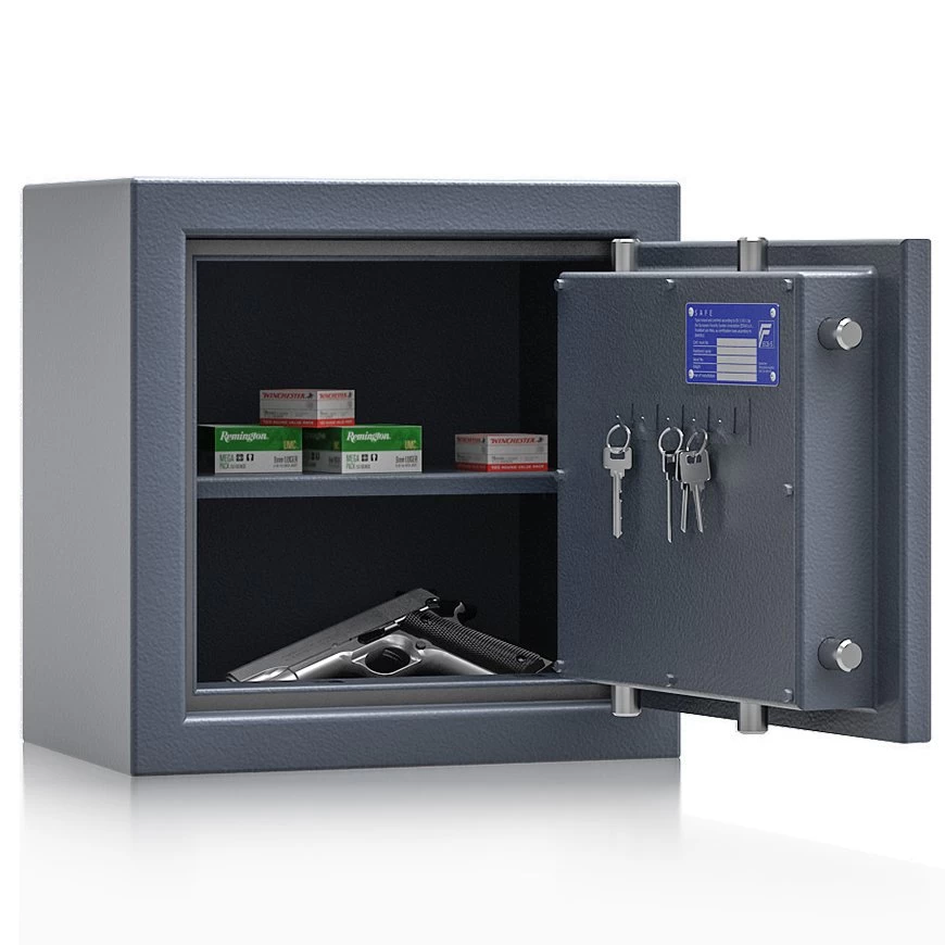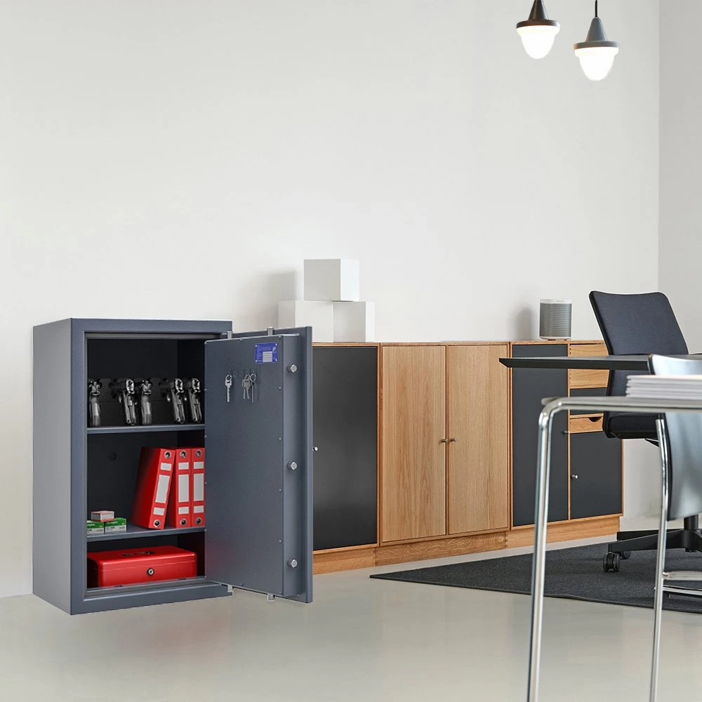 Diese Waffentresore bestehen aus einem doppelwandigen Korpus (25 mm stark) und einer mehrwandigen Tür (74 mm stark), die mit hochentwickeltem Füllmaterial ausgekleidet sind, bieten diese Schränke hohen Einbruchswiderstand bei gleichzeitig geringem Gewicht. Eine starke 3-seitige Verriegelung über massive Riegelbolzen, sowie ein zusätzliches Hintergreifprofil an der Bandseite verschließt die Safes zuverlässig.