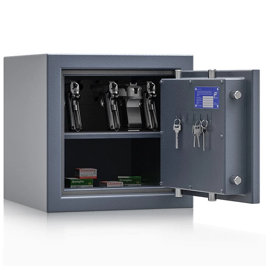 Diese Waffentresore bestehen aus einem doppelwandigen Korpus (25 mm stark) und einer mehrwandigen Tür (74 mm stark), die mit hochentwickeltem Füllmaterial ausgekleidet sind, bieten diese Schränke hohen Einbruchswiderstand bei gleichzeitig geringem Gewicht. Eine starke 3-seitige Verriegelung über massive Riegelbolzen, sowie ein zusätzliches Hintergreifprofil an der Bandseite verschließt die Safes zuverlässig.