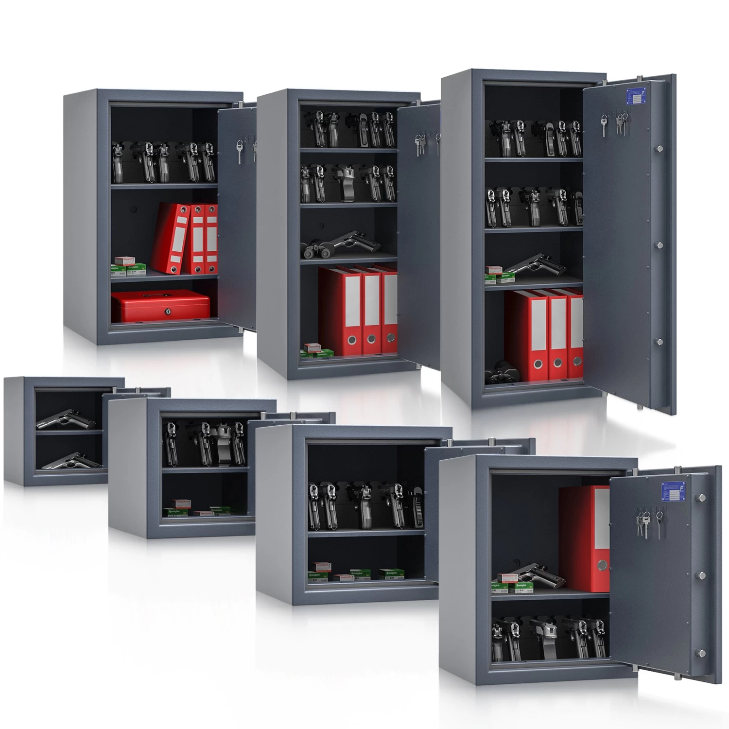 Die Kurzwaffenschränke Osprey von Secureo sind in 7 verschiedenen Größen erhältlich und dadurch ideal für die Aufbewahrung von Handfeuerwaffen, Wertgegenständen und Bargeld geeignet. Mit Widerstandsgrad 1 übertreffen sie dabei die strengen Vorgaben des Gesetzgebers. Alle Modelle außer Osprey 1 werden serienmäßig mit einem Schaumstoff-Waffenhalter für 6-8 Kurzwaffen geliefert. Weitere Waffenhalter können im Konfigurator hinzugefügt werden.