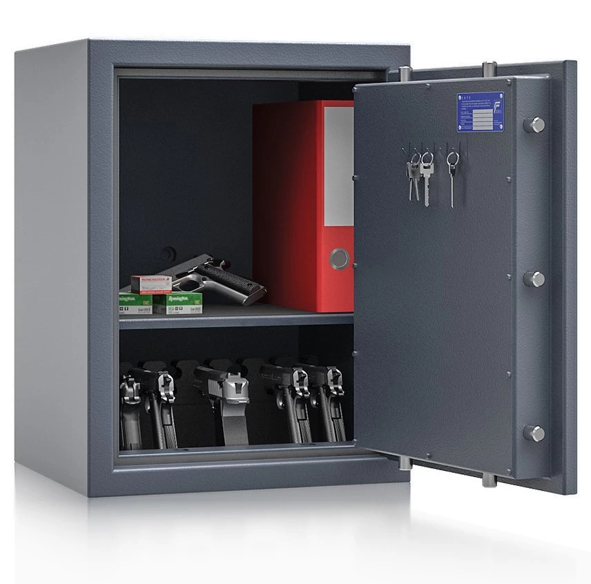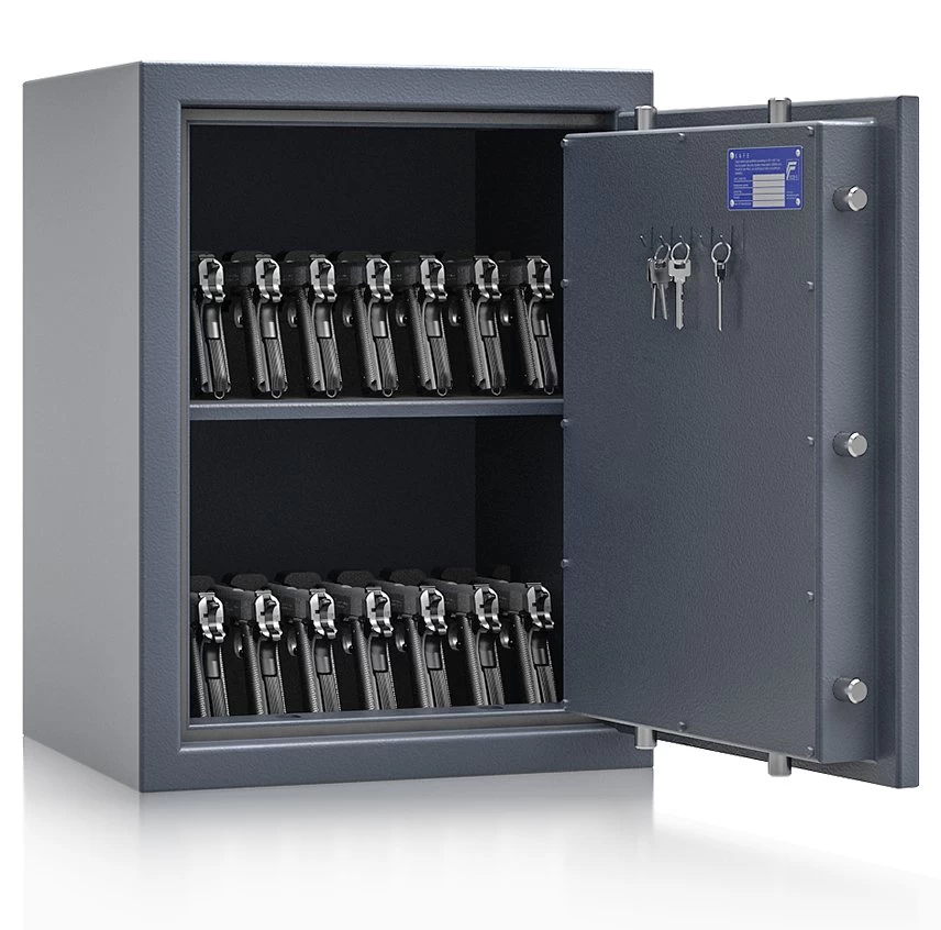 Diese Waffentresore bestehen aus einem doppelwandigen Korpus (25 mm stark) und einer mehrwandigen Tür (74 mm stark), die mit hochentwickeltem Füllmaterial ausgekleidet sind, bieten diese Schränke hohen Einbruchswiderstand bei gleichzeitig geringem Gewicht. Eine starke 3-seitige Verriegelung über massive Riegelbolzen, sowie ein zusätzliches Hintergreifprofil an der Bandseite verschließt die Safes zuverlässig.
