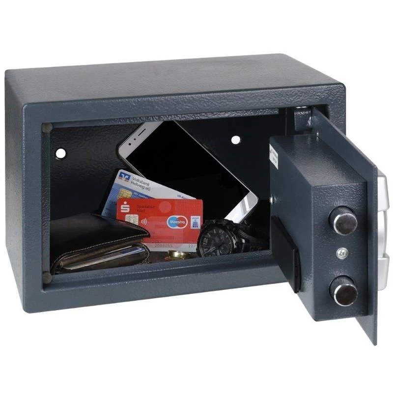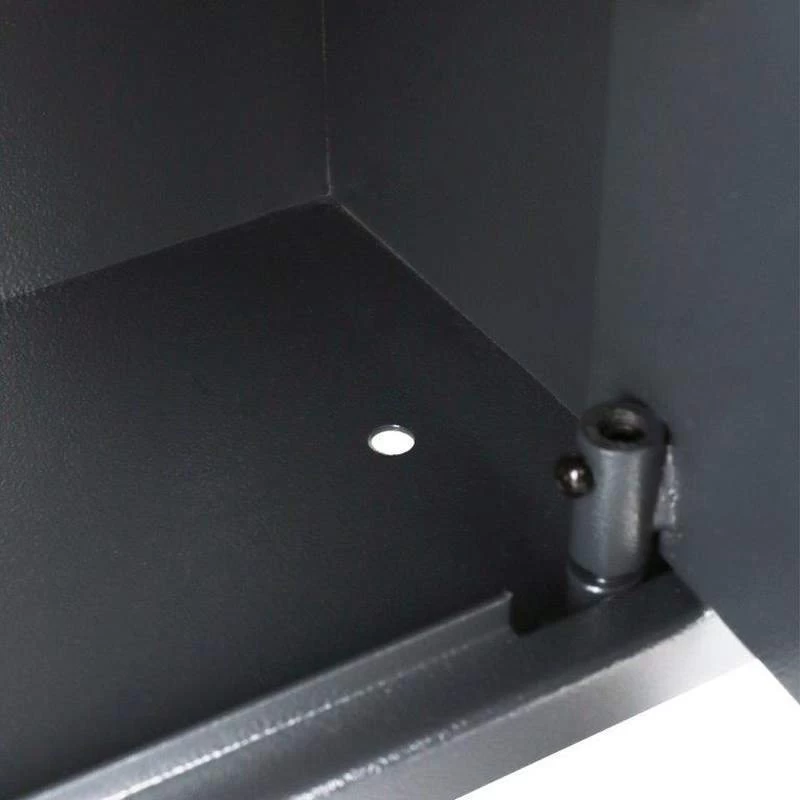 Das elektronische Zahlenschloss kann individuell programmiert werden und mit einem 3- bis 8-stelligen Code geöffnet werden. Für zusätzliche Sicherheit sorgt der mechanische Notschlüssel, mit dem der Safe auch bei einer vollständigen Entladung der Batterien geöffnet werden kann. Dieses Notschloss befindet sich gut versteckt zwischen Tastenfeld und Drehverschluss. Alle Modelle sind zur Wand- und Bodenverankerung vorgerichtet und können dadurch sehr flexibel positioniert werden. Der Lieferumfang enthält Material für 2 Verankerungen, sowie die erforderlichen Batterien für das Schloss. Die Oberfläche ist kratzfest pulverbeschichtet und in modernem anthrazit gehalten. Der Möbeltresor EL 1 verfügt über die Innenmaße 196 x 306 x 140 mm (HxBxT) und eignet sich dadurch auch für Dokumente im DIN A5-Format.
