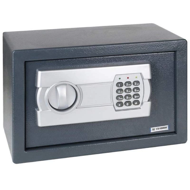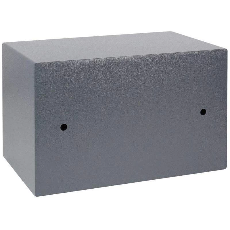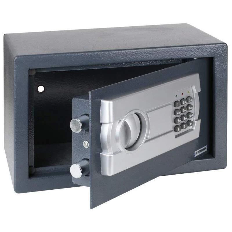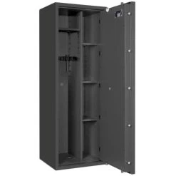 Das elektronische Zahlenschloss kann individuell programmiert werden und mit einem 3- bis 8-stelligen Code geöffnet werden. Für zusätzliche Sicherheit sorgt der mechanische Notschlüssel, mit dem der Safe auch bei einer vollständigen Entladung der Batterien geöffnet werden kann. Dieses Notschloss befindet sich gut versteckt zwischen Tastenfeld und Drehverschluss. Alle Modelle sind zur Wand- und Bodenverankerung vorgerichtet und können dadurch sehr flexibel positioniert werden. Der Lieferumfang enthält Material für 2 Verankerungen, sowie die erforderlichen Batterien für das Schloss. Die Oberfläche ist kratzfest pulverbeschichtet und in modernem anthrazit gehalten. Der Munitionsschrank EL 2 verfügt über die Innenmaße 246 x 346 x 190 mm (HxBxT) und eignet sich dadurch auch für Dokumente im DIN A4-Format.