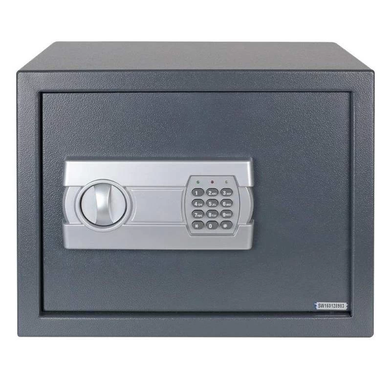 Das elektronische Zahlenschloss kann individuell programmiert werden und mit einem 3- bis 8-stelligen Code geöffnet werden. Für zusätzliche Sicherheit sorgt der mechanische Notschlüssel, mit dem der Safe auch bei einer vollständigen Entladung der Batterien geöffnet werden kann. Dieses Notschloss befindet sich gut versteckt zwischen Tastenfeld und Drehverschluss. Im Innenraum befindet sich ein Fachboden, der bei Bedarf auch herausgenommen werden kann. Die verschweißten Auflagebleche des Fachbodens können nicht entfernt werden und verbleiben auf den Seiten des Tresors.