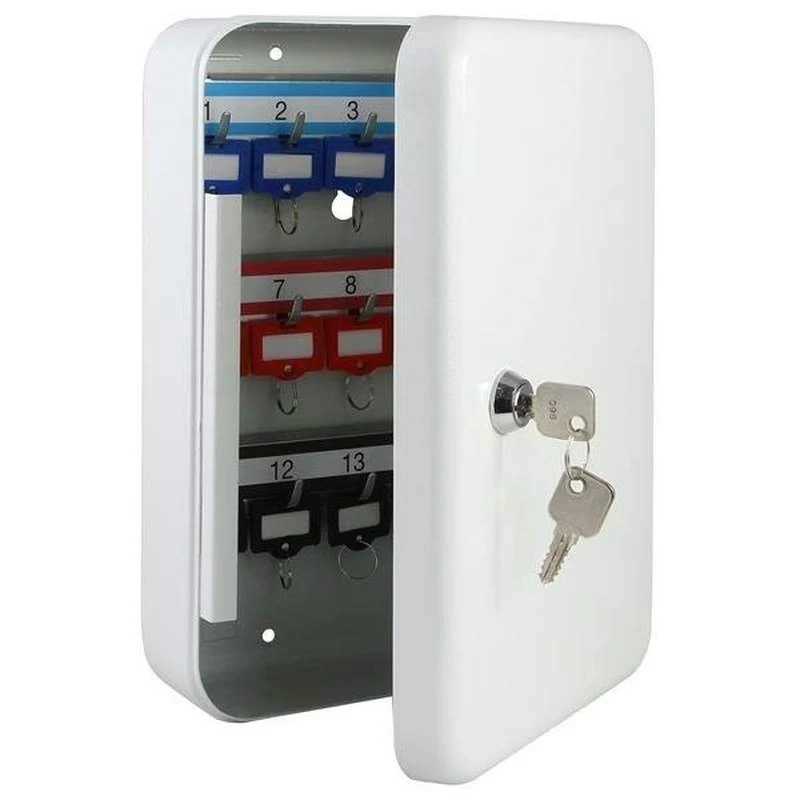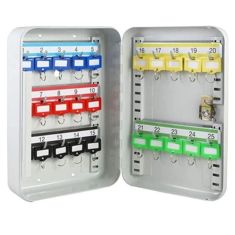 Der Schlüsselkasten besteht aus nahtlos gezogenem Stahl. Durch 3 Bohrungen in der Rückwand wird eine sichere Verankerung ermöglicht. Die kratzfeste Pulverbeschichtung ist in diskretem Lichtgrau gehalten. Im Lieferumfang befinden sich 25 farblich-sortierte Schlüsselanhänger.