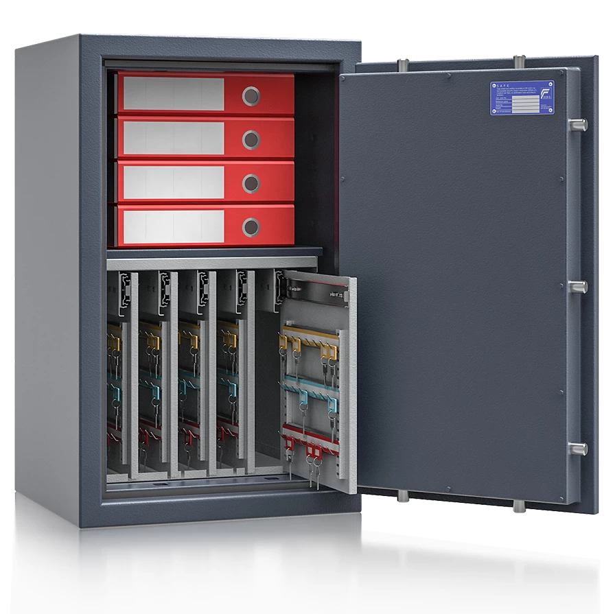 Der Osprey Key 5-B ist serienmäßig mit einem Schlüsseleinsatz mit 5 ausziehbaren Wänden auf Teleskopschienen ausgestattet. Diese Auszugstafeln verfügen über ein ausgeklügeltes Rastersystem auf welchem pro Tafel insgesamt 7 Hakenleisten individuell eingehängt werden können. Die Hakenleisten wiederum beherbergen jeweils 8 Schlüsselhaken. Daraus ergibt sich eine maximale Kapazität von 280 Schlüsseln. Oberhalb des Schlüsselmoduls befindet sich ein Fachboden, welcher für zusätzlichen Stauraum für Dokumente und Wertgegenstände sorgt.
