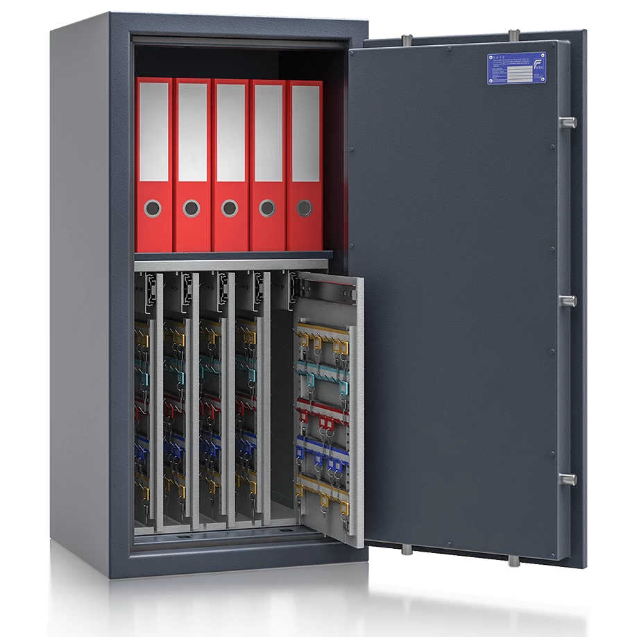 Die Schlüsseltresore Osprey Key von Secureo sind ideale Safes für die Aufbewahrung von sensiblen Schlüsseln. Die Osprey Key-Serie umfasst insgesamt 18 Modelle die in 8 Größen, unterschiedlichste Ausstattungsvarianten mit bis zu 880 Schlüsselhaken aufweisen. Alle Modelle bestehen aus einer mehrwandigen Konstruktion welche mit hochentwickeltem Füllmaterial ausgekleidet ist. Damit bieten sie sehr guten Einbruchschutz bei gleichzeitig geringem Gewicht. Eine starke 3-seitige Verriegelung über massive Riegelbolzen, sowie ein zusätzliches Hintergreifprofil an der Bandseite verschließt die Safes zuverlässig.