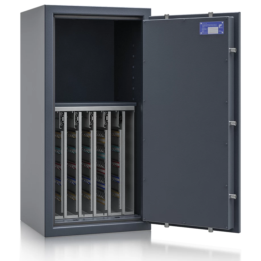 Im Gegensatz zu den meisten Tresoren werden diese Schlüsseltresore serienmäßig mit einem hochsicheren Doppelbartschloss ausgeliefert, welches über 3 Schlüssel (95 mm lang) verfügt. Auf Wunsch steht jedes Modell auch mit einem komfortablen elektronischen Tastenschloss zur Auswahl. Für einfache Bedienung sorgt der angebrachte Muschelgriff.