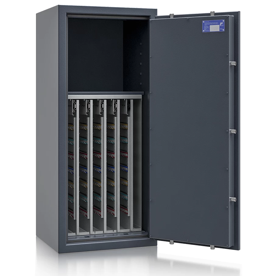 Im Gegensatz zu den meisten Tresoren werden diese Schlüsseltresore serienmäßig mit einem hochsicheren Doppelbartschloss ausgeliefert, welches über 3 Schlüssel (95 mm lang) verfügt. Auf Wunsch steht jedes Modell auch mit einem komfortablen elektronischen Tastenschloss zur Auswahl. Für einfache Bedienung sorgt der angebrachte Muschelgriff.