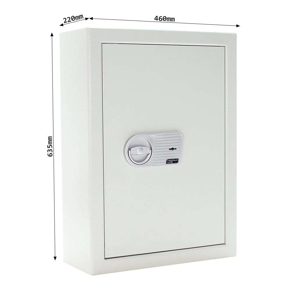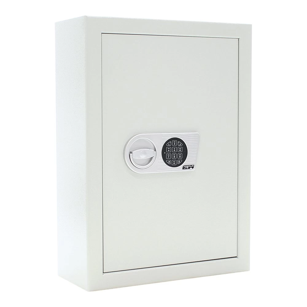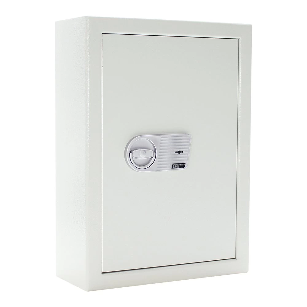 Standardmäßig wird dieser Schlüsselsafe mit einem hochsicheren Doppelbartschloss der Klasse A (EN 1300), inklusive 2 Schlüsseln ausgeliefert. Optional steht das Modell auch mit einem komfortablen Elektronikschloss zur Auswahl. Der aufgesetzte Beschlag trägt bei beiden Varianten ca. 15 mm auf.