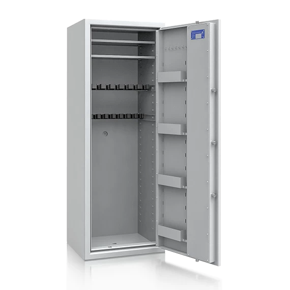 Diese zuverlässigen Waffenschränke von Secureo ermöglichen eine kostengünstige, gesetzeskonforme Lagerung von Langwaffen, Kurzwaffen und Munition. Das Modell erfüllt mit Widerstandsgrad 0/N gemäß EN 1143-1, zertifiziert durch ECB-S, die strengen Auflagen des Gesetzgebers und ermöglicht Versicherungssummen von bis zu € 40.000,-. Der Hawk 16 XL bietet Raum für bis zu 16 Langwaffen in 2 Reihen und verfügt zudem über großzügigen Stauraum auf 2 verstell- und herausnehmbaren Fachböden und den 4 verstellbaren Ablagefächern an der Tür.