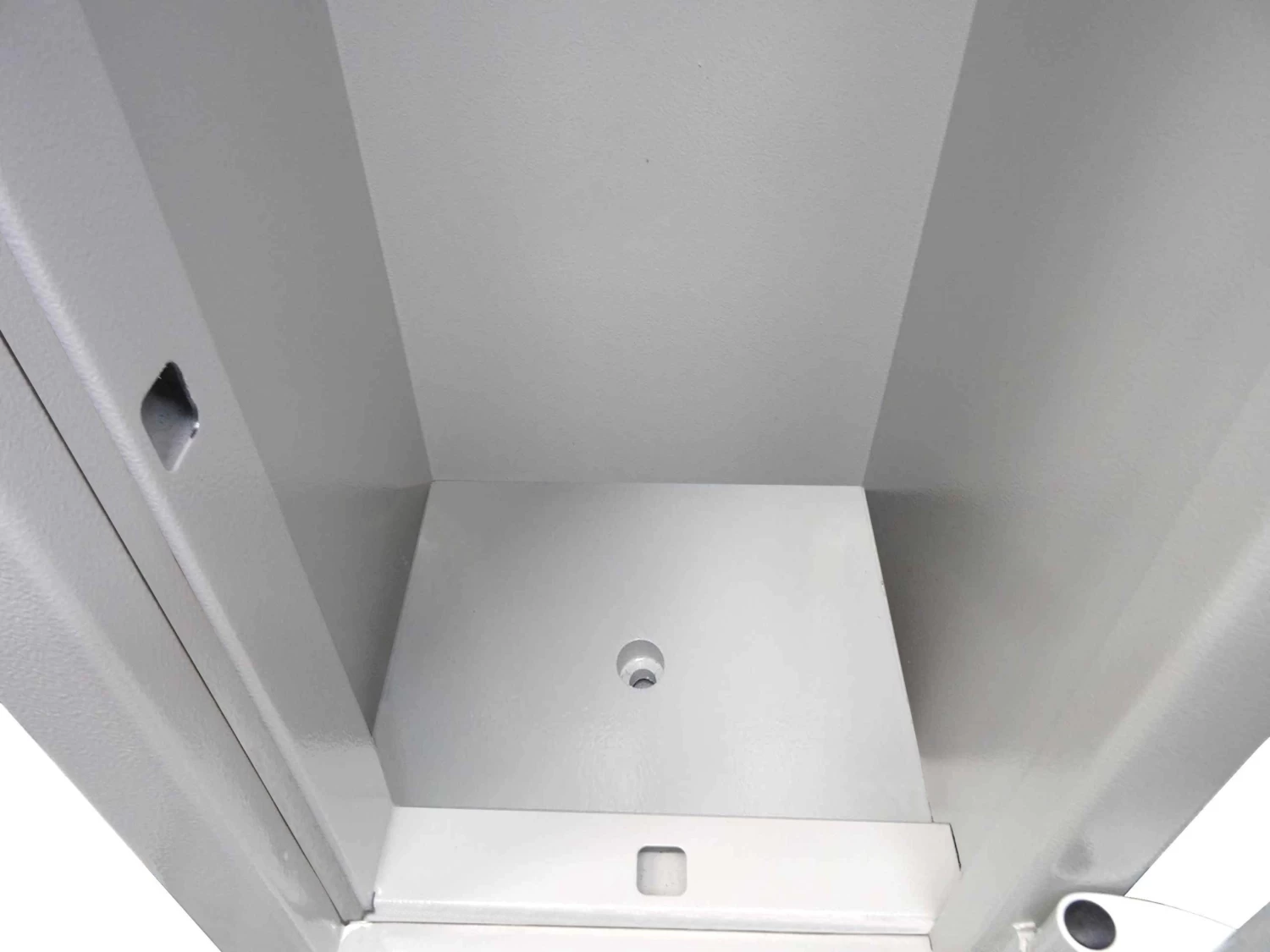 Für einen sicheren Stand sorgen die Verankerungsbohrungen am Boden und in der Rückwand (nicht durchgebohrt), das Verankerungsmaterial für eine Verankerung liegt dem Lieferumfang bei. Die Lackierung ist in schlichtem lichtgrau (RAL 7035) ausgeführt.