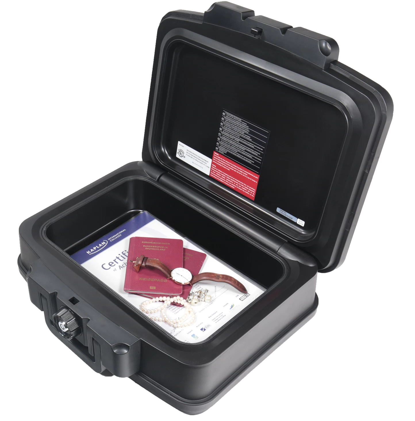 Diese feuer- und wasserfesten Dokumentenkassetten bieten hochwertigen, 30-minütigen Brandschutz, zertifiziert durch UL (Underwriters Laboratories) und zuverlässigen Schutz vor Wassereintritt (SGS-zertifiziert). Das eingesetzte Testverfahren des Brandschutzes setzt voraus, dass die Innentemperatur nicht über 177°C steigt. Bei Temperaturen darüber würde Papier verschwärzen. Getestet wird bei einer Temperatur von 843°C. Die Wasserdichtigkeit wurde durch unabhängige Prüfungen bestätigt und sagt aus, dass der Innenbereich für bis zu 24 Stunden unter Wasser trocken bleibt.