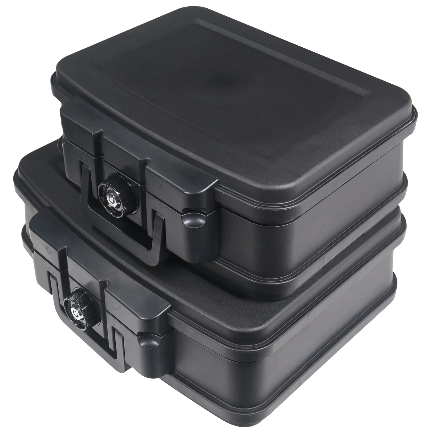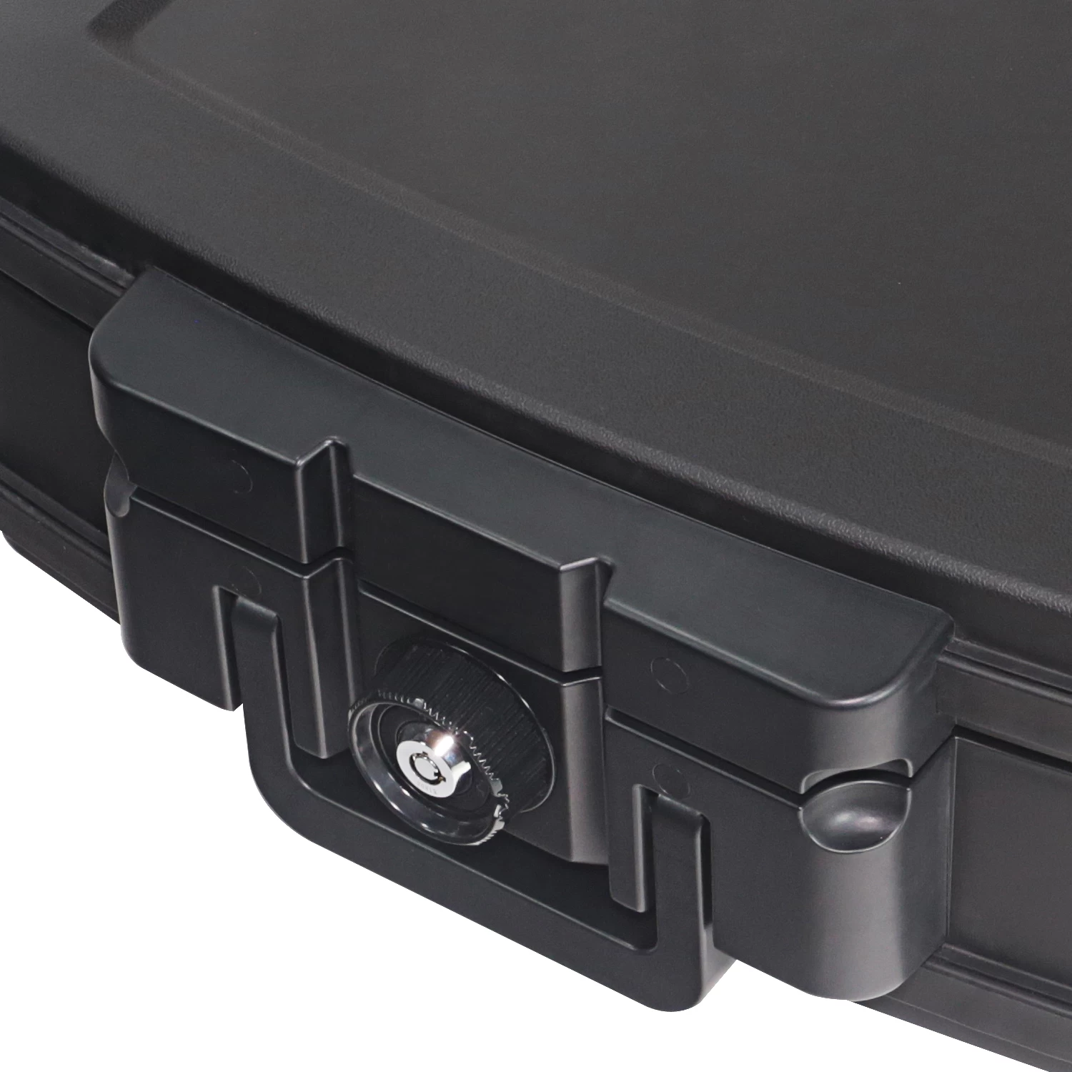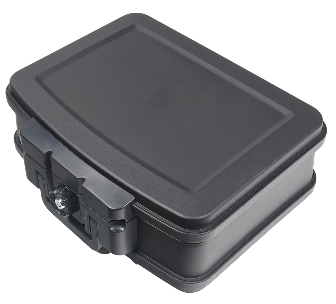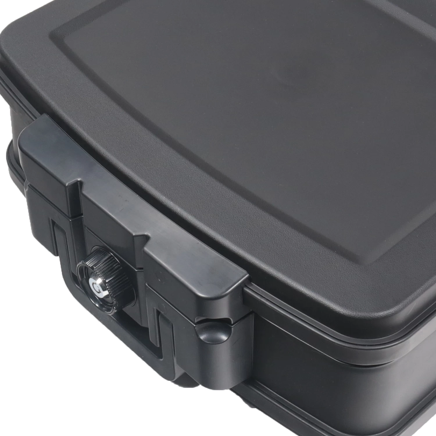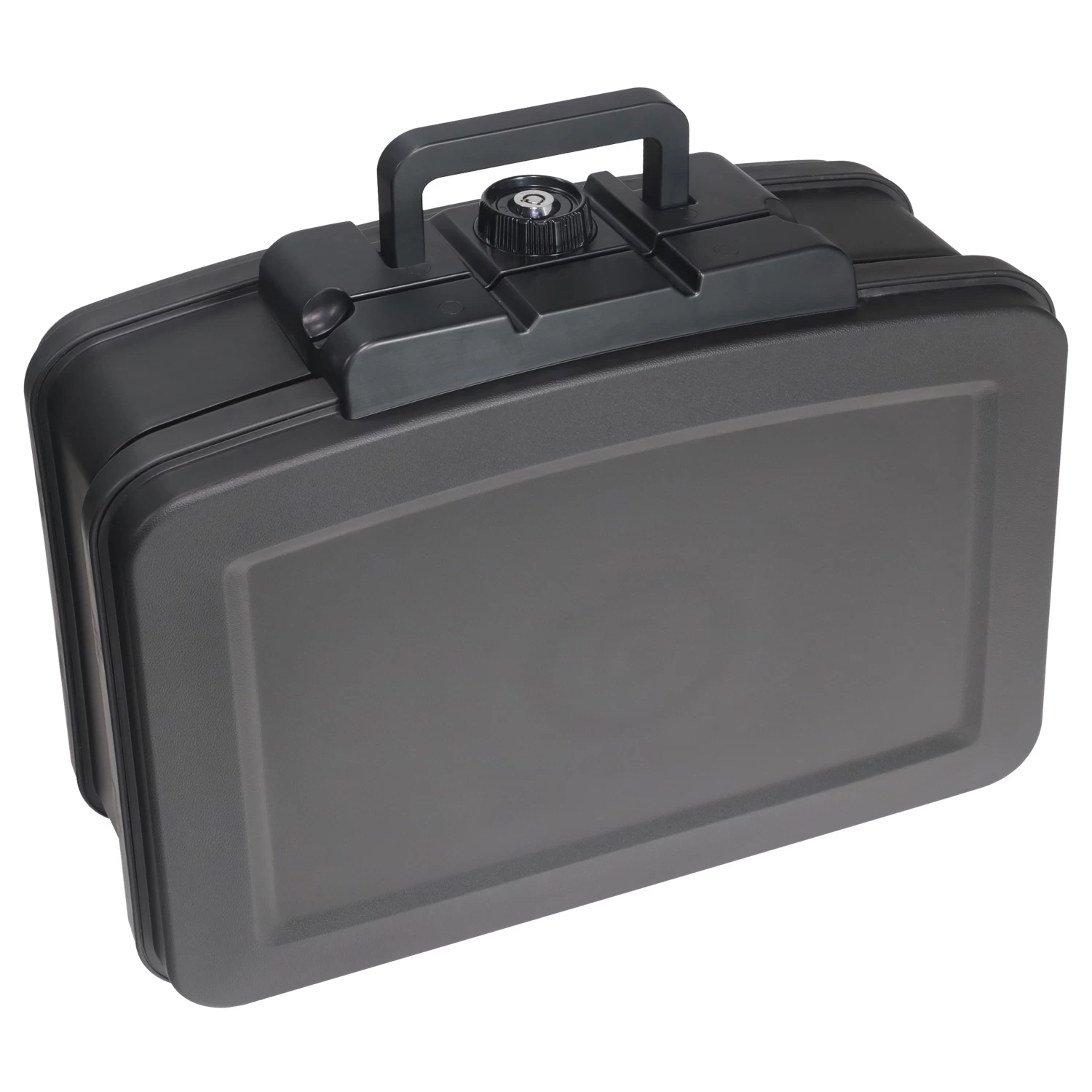 Die Dokumentenkassette ist aus einem hochentwickelten und speziell-versiegelten Polymer-Kunststoff gefertigt und verfügt über ein Sicherheits-Zylinderschloss. Dadurch wird ein sicherer, wasser- und luftdichter Verschluss gewährleistet. Die Scharniere sind Innen angebracht, was für ein formschönes Design sorgt. Ein stabiler Tragegriff ermöglicht den einfachen und handlichen Transport. Mit den Abmessungen 16,5 x 44,5 x 33 mm (HxBxT) eignet Sie sich zur bequemen Lagerung von Dokumenten bis zu einem Format von DIN A4. Es steht ebenfalls ein kleineres Modell für DIN A5 Dokumente zur Auswahl.