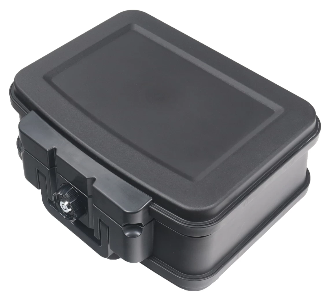 Die Dokumentenkassette ist aus einem hochentwickelten und speziell-versiegelten Polymer-Kunststoff gefertigt und verfügt über ein Sicherheits-Zylinderschloss. Dadurch wird ein sicherer, wasser- und luftdichter Verschluss gewährleistet. Die Scharniere sind Innen angebracht, was für ein formschönes Design sorgt. Ein stabiler Tragegriff ermöglicht den einfachen und handlichen Transport. Mit den Abmessungen 16,5 x 38,5 x 28 mm (HxBxT) eignet Sie sich zur bequemen Lagerung von Dokumenten bis zu einem Format von DIN A5. Es steht ein weiteres Modell für DIN A4 Dokumente zur Auswahl.