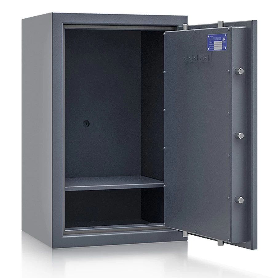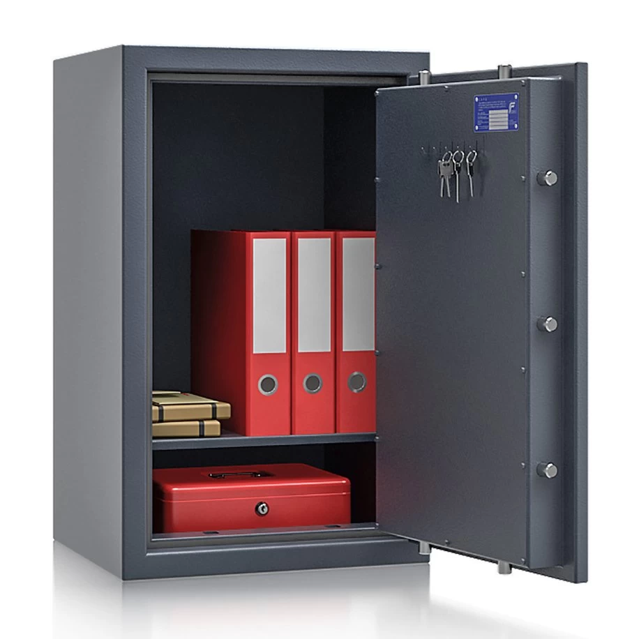 Im Gegensatz zu vergleichbaren Schränken werden diese Wertschutztresore serienmäßig mit einem hochsicheren Doppelbartschloss ausgeliefert, welches über 3 Schlüssel (95 mm lang) verfügt. Auf Wunsch steht jedes Modell auch mit einem komfortablen elektronischen Tastenschloss zur Auswahl. Für einfache Bedienung sorgt der angebrachte Muschelgriff.