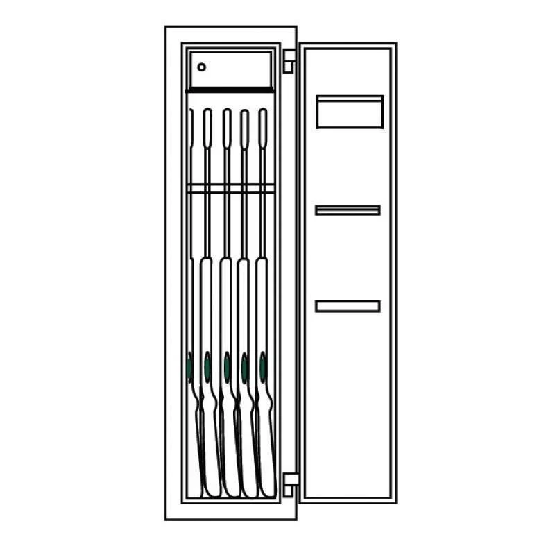 Im Inneren des Waffenschranks befinden sich ein Putzstock- und ein Waffenhalter sowie ein verschließbares Innenfach. Das Modell WSE150/80 bietet 2 Fachböden und 2 Innenfächer.